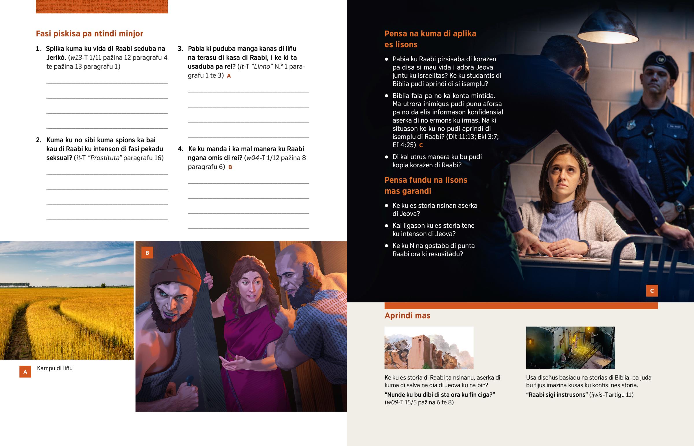 Un dia di noti, dus omi stranjeru bin pa si kau pa buska kau di durmi. Raabi rapada logu di kuma ki dus omi seduba spions isrealita! Ma i ka el ba so ku rapada ki omis. Rei di Jerikó manda omis pa si kau pa falal pa i tira ki spions fora. Raabi tenba ku toma un disison ku pudi muda si vida. Sera ki i na disidi juda povu mau di si sidadi o i na bai pa ladu di Jeova?