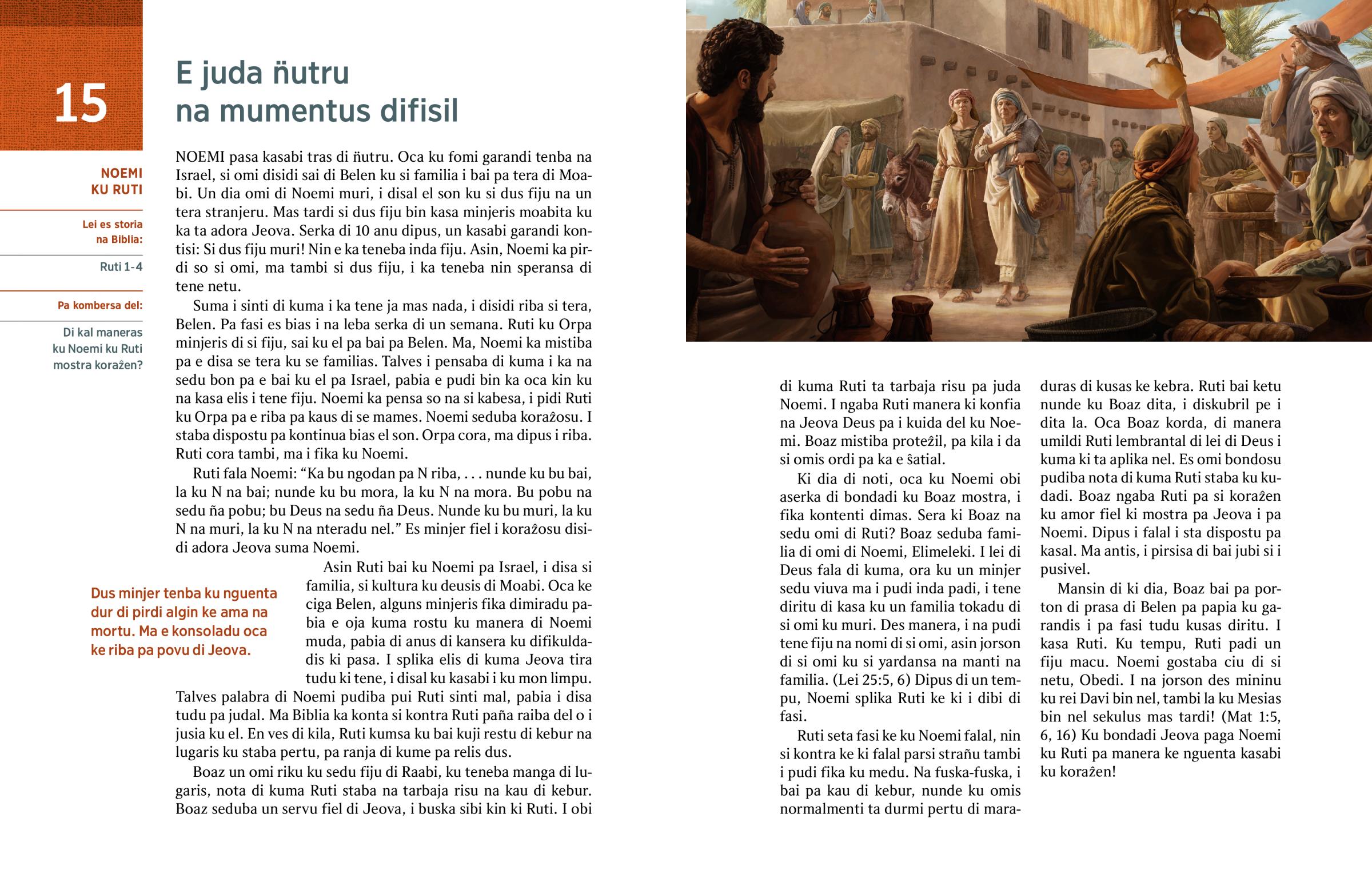 NOEMI pasa kasabi tras di n̈utru. Oca ku fomi garandi tenba na Israel, si omi disidi sai di Belen ku si familia i bai pa tera di Moabi. Un dia omi di Noemi muri, i disal el son ku si dus fiju na un tera stranjeru. Mas tardi si dus fiju bin kasa minjeris moabita ku ka ta adora Jeova. Serka di 10 anu dipus, un kasabi garandi kontisi: Si dus fiju muri! Nin e ka teneba inda fiju. Asin, Noemi ka pirdi so si omi, ma tambi si dus fiju, i ka teneba nin speransa di tene netu.