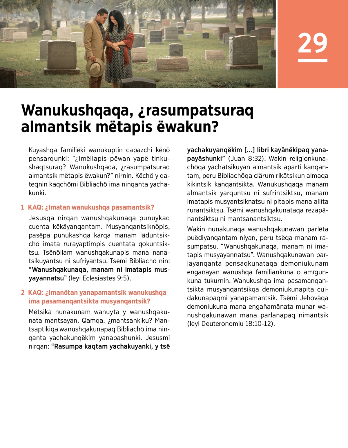 Wanushqakunapaq Bibliachö ima ninqanta, kuyakoq Diosnintsikman mas confiakunapaq y wanushqakuna mana sufriyanqantam yachakushun.