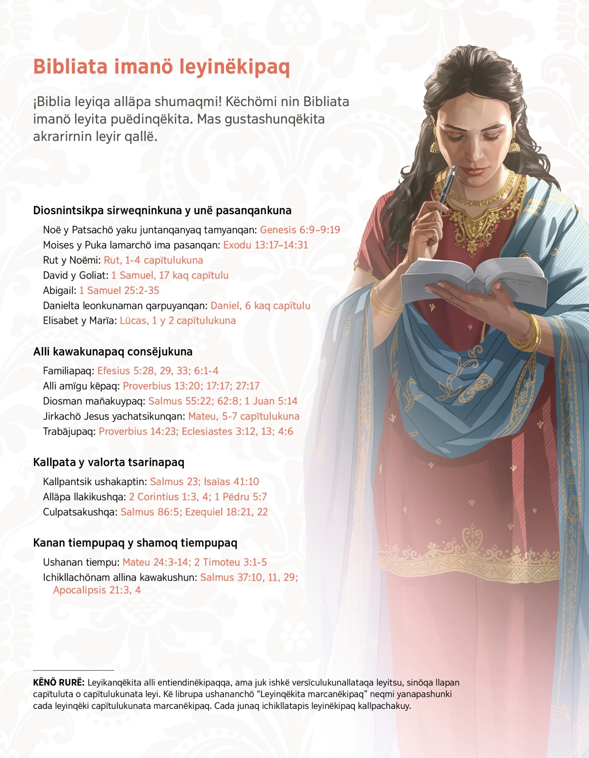 KËNÖ RURË: Leyikanqëkita alli entiendinëkipaqqa, ama juk ishkë versïculukunallataqa leyitsu, sinöqa llapan capïtuluta o capïtulukunata leyi. Kë librupa ushananchö “Leyinqëkita marcanëkipaq” neqmi yanapashunki cada leyinqëki capïtulukunata marcanëkipaq. Cada junaq ichikllatapis leyinëkipaq kallpachakuy.
