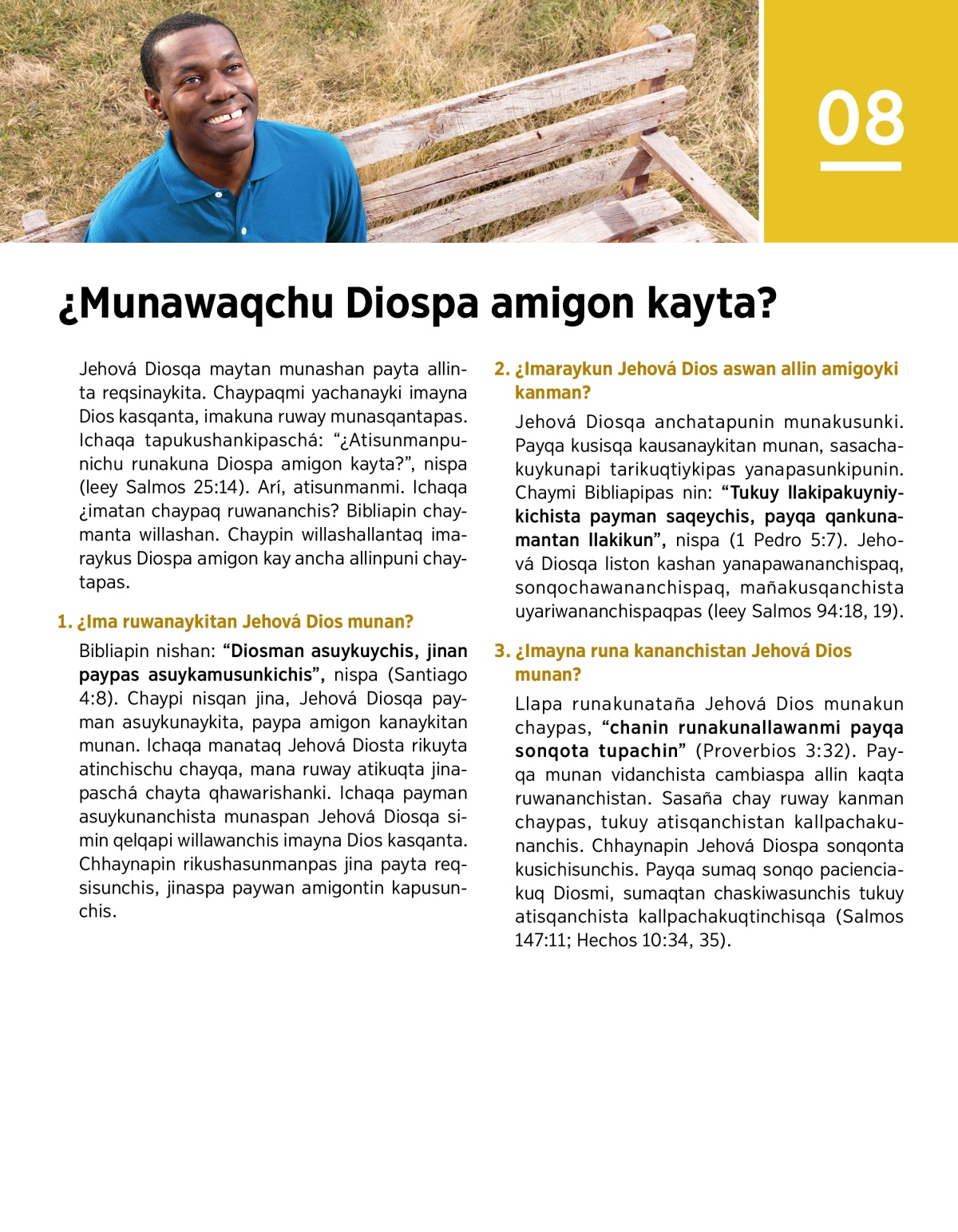 Jehová Diosqa maytan munashan payta allinta reqsinaykita. Chaypaqmi yachanayki imayna Dios kasqanta, imakuna ruway munasqantapas. Ichaqa tapukushankipaschá: “¿Atisunmanpunichu runakuna Diospa amigon kayta?”, nispa (leey Salmos 25:14). Arí, atisunmanmi. Ichaqa ¿imatan chaypaq ruwananchis? Bibliapin chaymanta willashan. Chaypin willashallantaq imaraykus Diospa amigon kay ancha allinpuni chaytapas.
