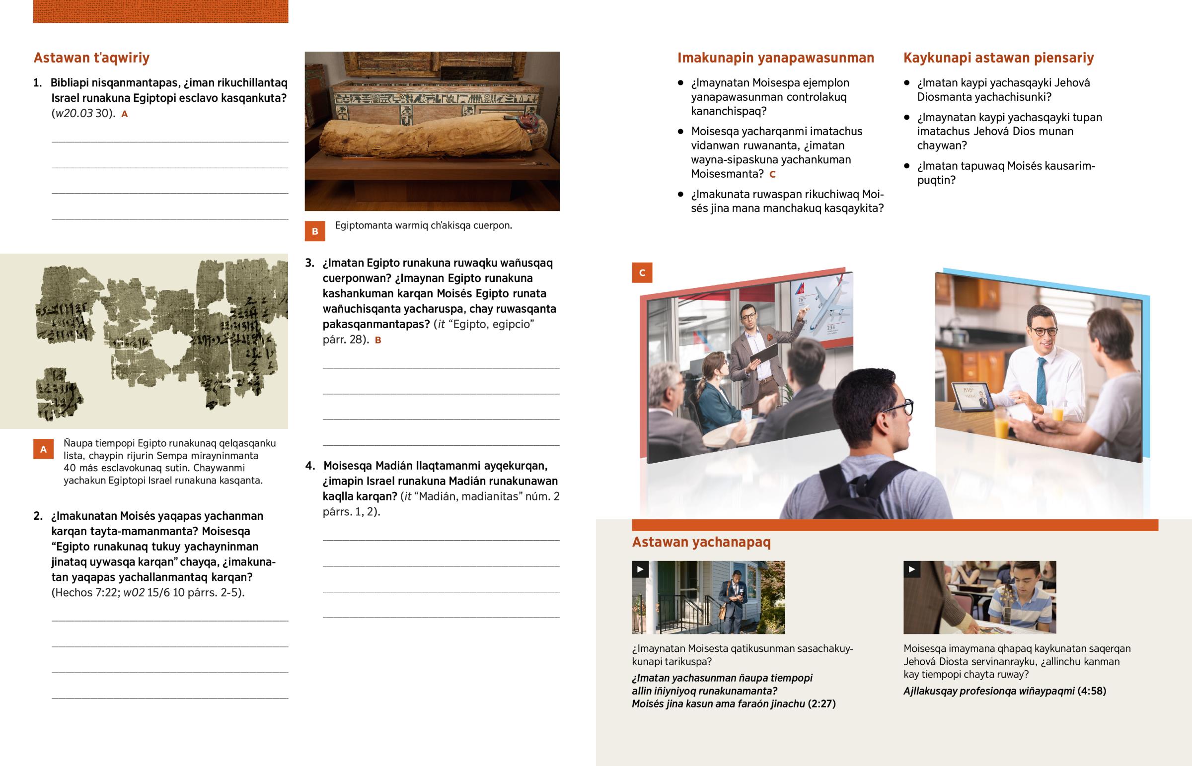 2. ¿Imakunatan Moisés yaqapas yachanman karqan tayta-mamanmanta? Moisesqa “Egipto runakunaq tukuy yachayninman jinataq uywasqa karqan” chayqa, ¿imakunatan yaqapas yachallanmantaq karqan? (Hechos 7:22; w02 15/6 10 párrs. 2-5).