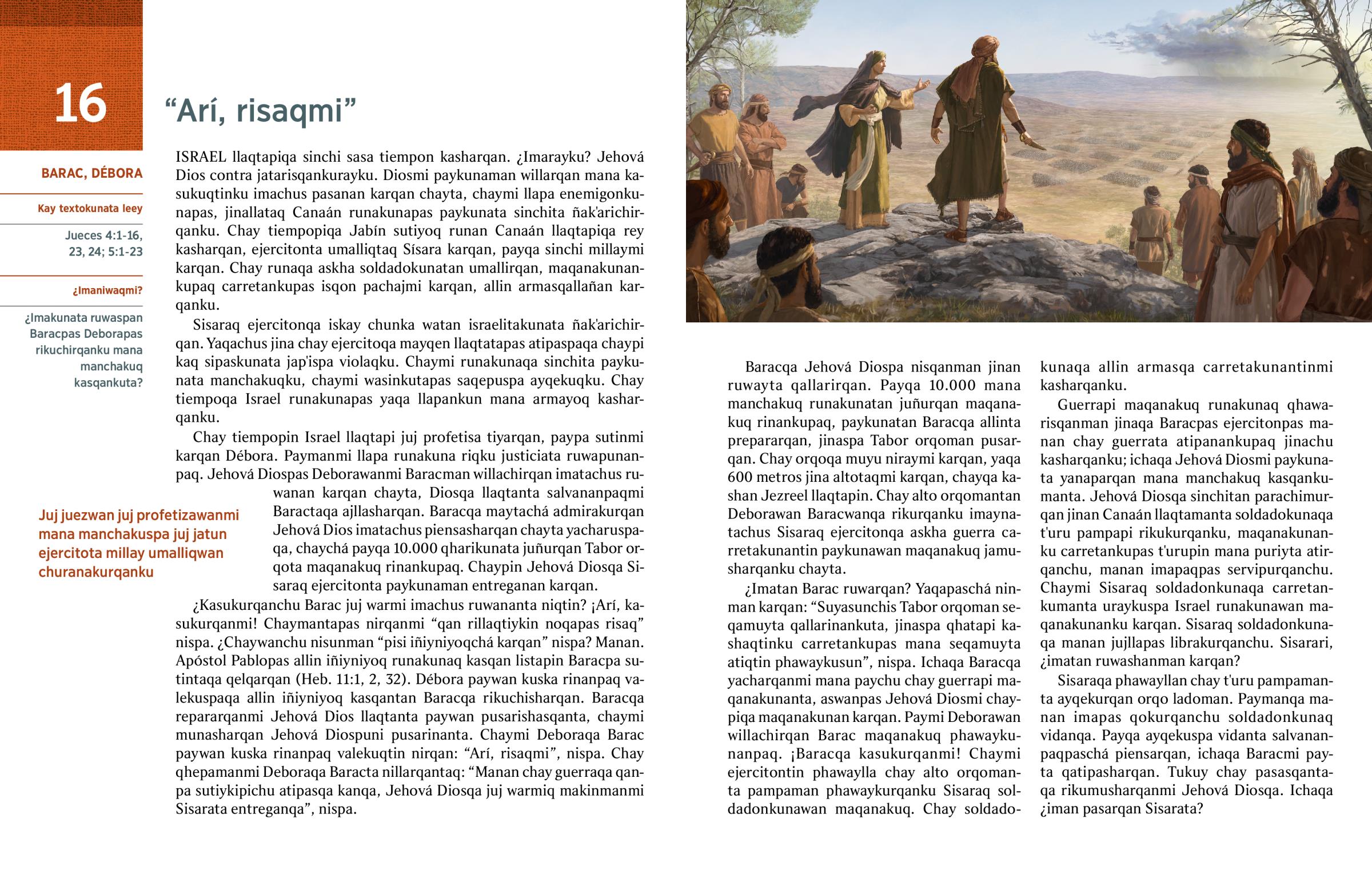 ¿Imatan Barac ruwarqan? Yaqapaschá ninman karqan: “Suyasunchis Tabor orqoman seqamuyta qallarinankuta, jinaspa qhatapi kashaqtinku carretankupas mana seqamuyta atiqtin phawaykusun”, nispa. Ichaqa Baracqa yacharqanmi mana paychu chay guerrapi maqanakunanta, aswanpas Jehová Diosmi chaypiqa maqanakunan karqan. Paymi Deborawan willachirqan Barac maqanakuq phawaykunanpaq. ¡Baracqa kasukurqanmi! Chaymi ejercitontin phawaylla chay alto orqomanta pampaman phawaykurqanku Sisaraq soldadonkunawan maqanakuq. Chay soldadokunaqa allin armasqa carretakunantinmi kasharqanku.