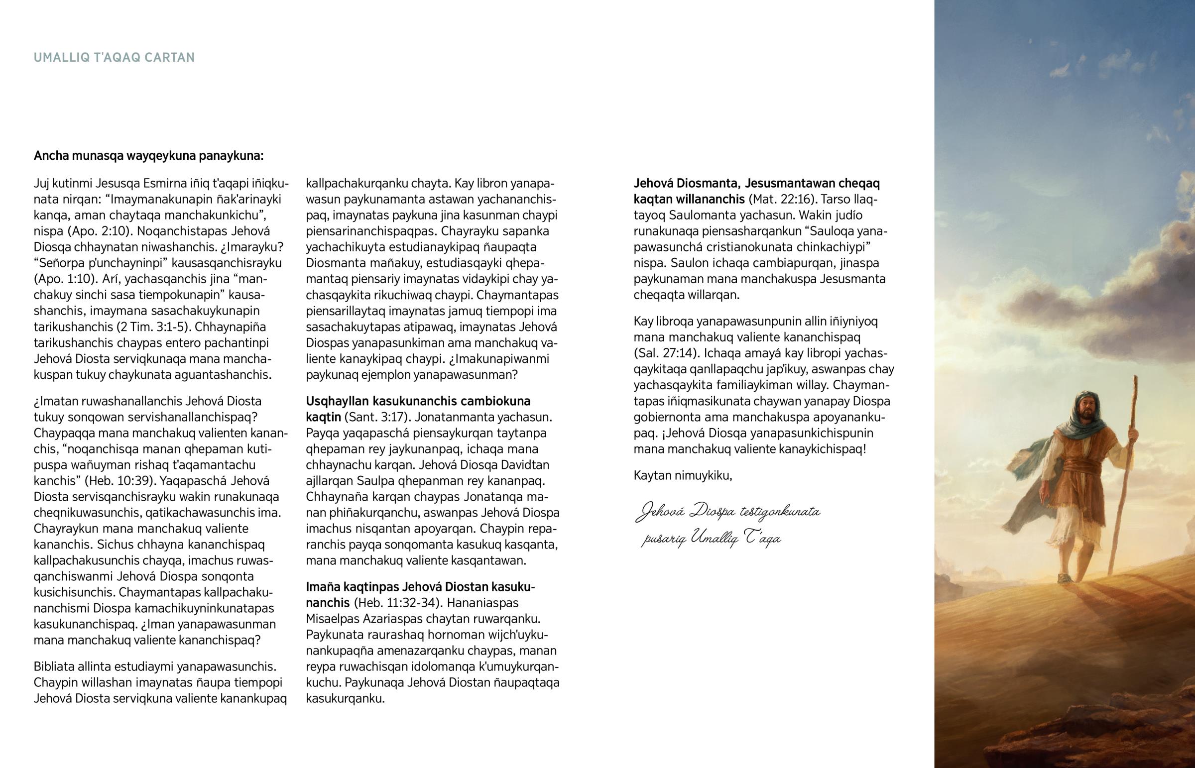 Kay libroqa yanapawasunpunin allin iñiyniyoq mana manchakuq valiente kananchispaq (Sal. 27:14). Ichaqa amayá kay libropi yachasqaykitaqa qanllapaqchu jap’ikuy, aswanpas chay yachasqaykita familiaykiman willay. Chaymantapas iñiqmasikunata chaywan yanapay Diospa gobiernonta ama manchakuspa apoyanankupaq. ¡Jehová Diosqa yanapasunkichispunin mana manchakuq valiente kanaykichispaq!