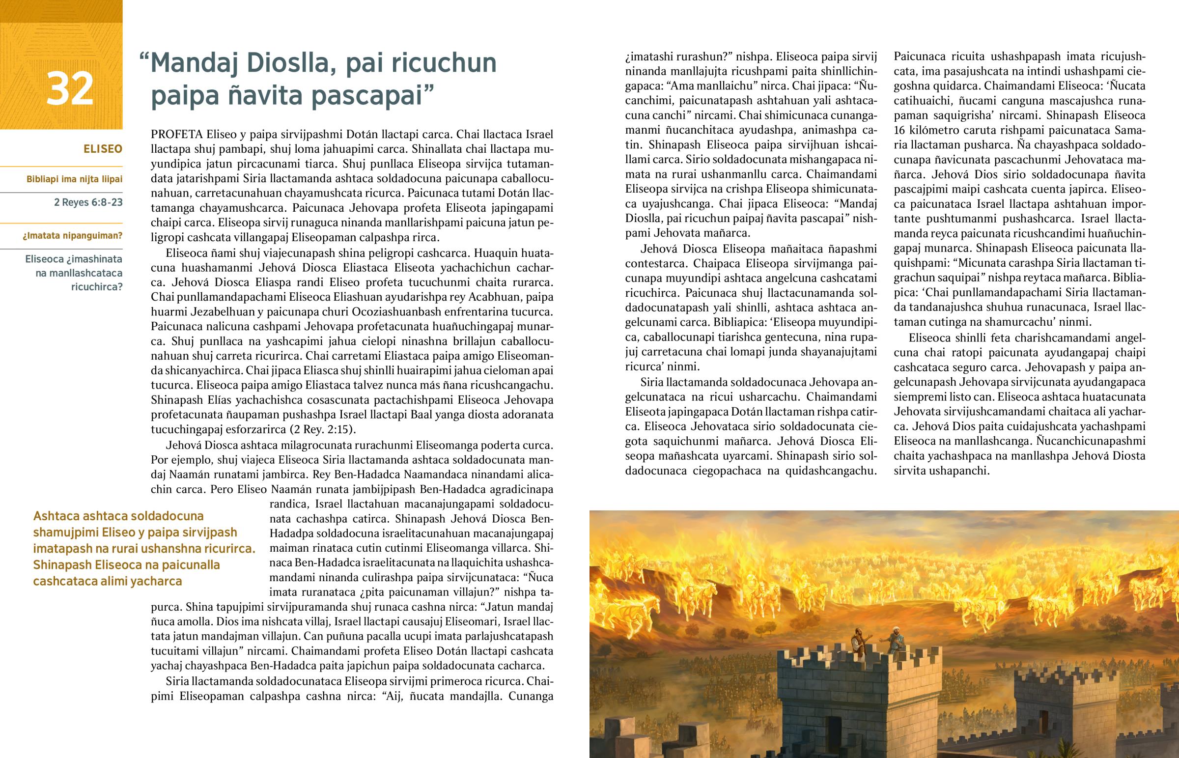 Jehová Diosca Eliseopa mañaitaca ñapashmi contestarca. Chaipaca Eliseopa sirvijmanga paicunapa muyundipi ashtaca angelcuna cashcatami ricuchirca. Paicunaca shuj llactacunamanda soldadocunatapash yali shinlli, ashtaca ashtaca angelcunami carca. Bibliapica: ‘Eliseopa muyundipica, caballocunapi tiarishca gentecuna, nina rupajuj carretacuna chai lomapi junda shayanajujtami ricurca’ ninmi.