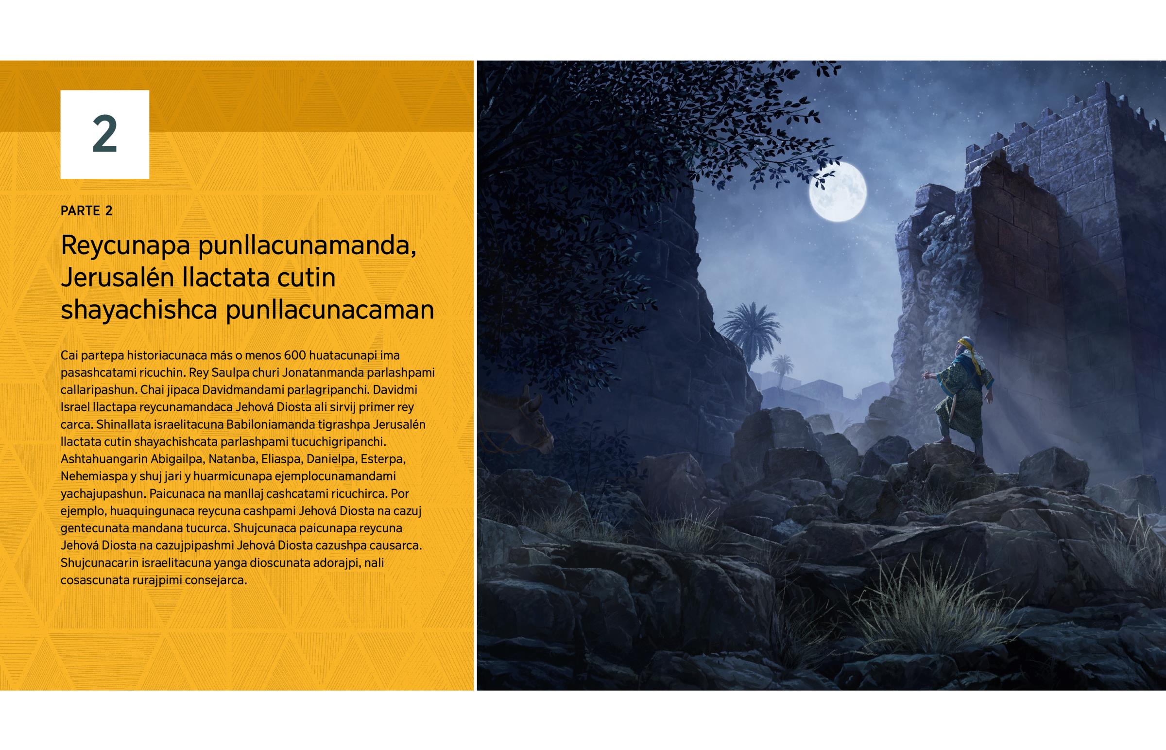 Cai partepa historiacunaca más o menos 600 huatacunapi ima pasashcatami ricuchin. Rey Saulpa churi Jonatanmanda parlashpami callaripashun. Chai jipaca Davidmandami parlagripanchi. Davidmi Israel llactapa reycunamandaca Jehová Diosta ali sirvij primer rey carca. Shinallata israelitacuna Babiloniamanda tigrashpa Jerusalén llactata cutin shayachishcata parlashpami tucuchigripanchi. Ashtahuangarin Abigailpa, Natanba, Eliaspa, Danielpa, Esterpa, Nehemiaspa y shuj jari y huarmicunapa ejemplocunamandami yachajupashun. Paicunaca na manllaj cashcatami ricuchirca. Por ejemplo, huaquingunaca reycuna cashpami Jehová Diosta na cazuj gentecunata mandana tucurca. Shujcunaca paicunapa reycuna Jehová Diosta na cazujpipashmi Jehová Diosta cazushpa causarca. Shujcunacarin israelitacuna yanga dioscunata adorajpi, nali cosascunata rurajpimi consejarca.