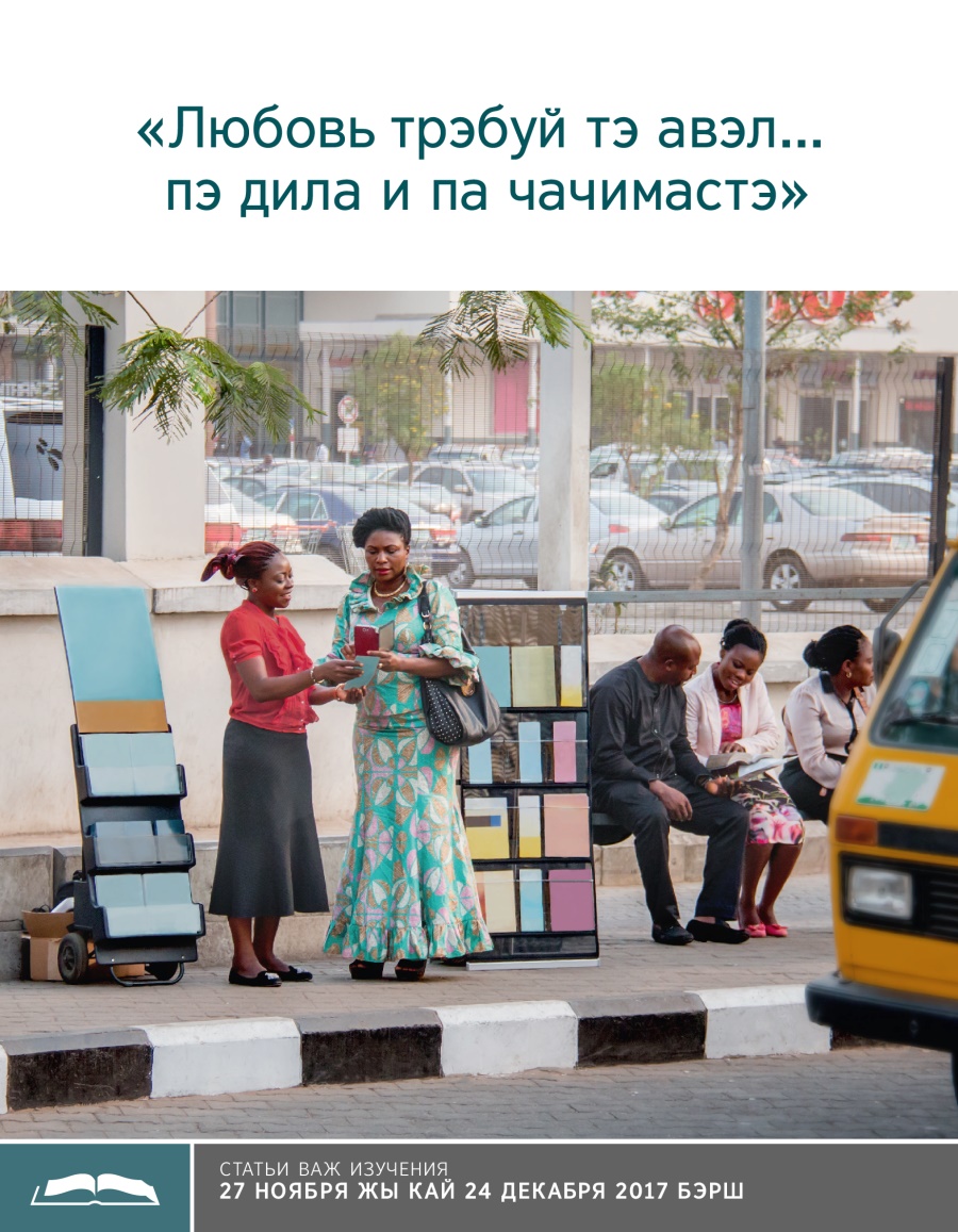 Пэ карточка дицол кати ек анда бут стендоря андо Лагосо, саво фартэ баро форо андэ Африка. Кадэва стендо тердёл котэ, кай исин бут мануша. Кажно шон варикай шов мануша анда кодэла, ко поджан каринг о стендо, мангэн, кай лэн тэ сытярэн па Библия.