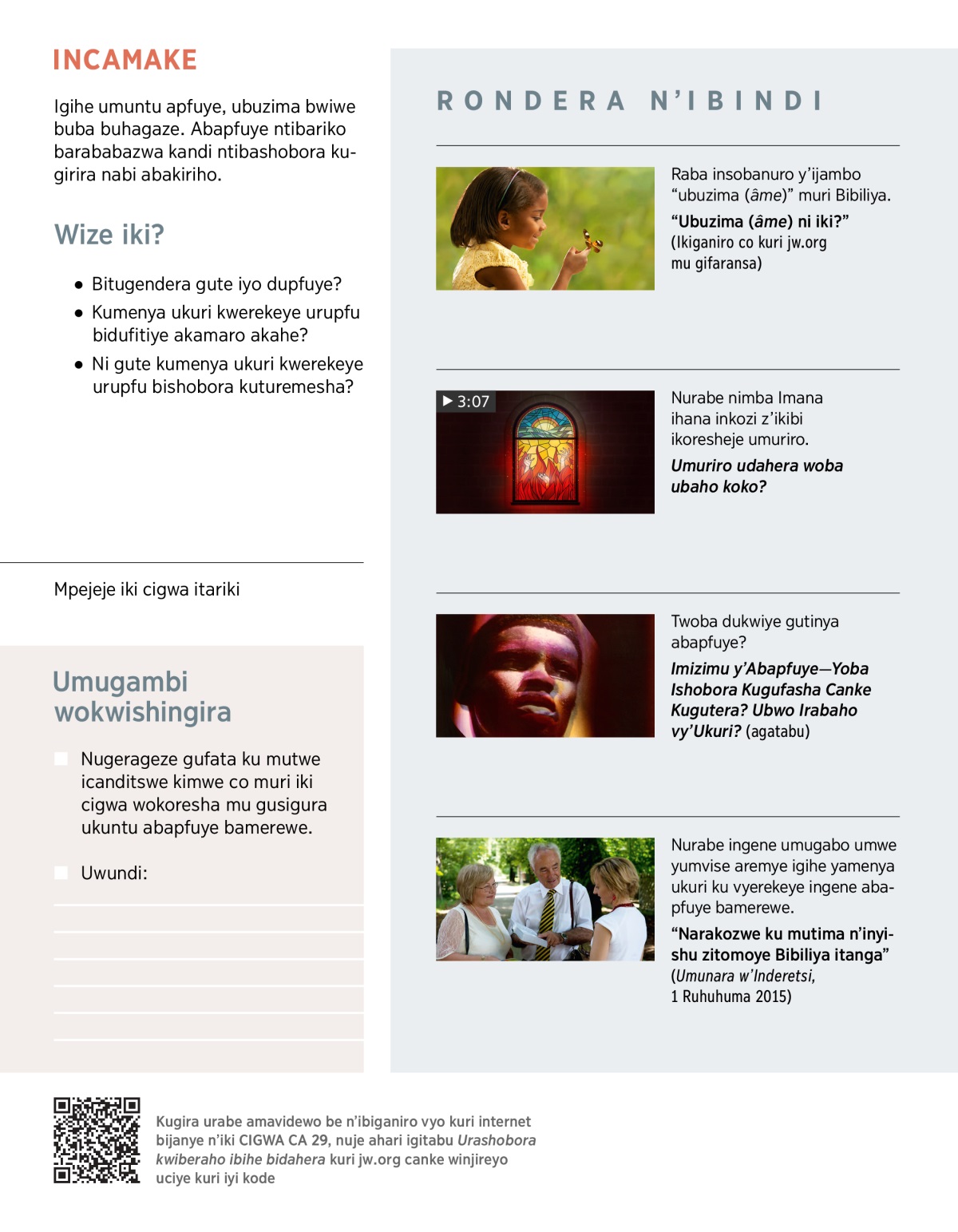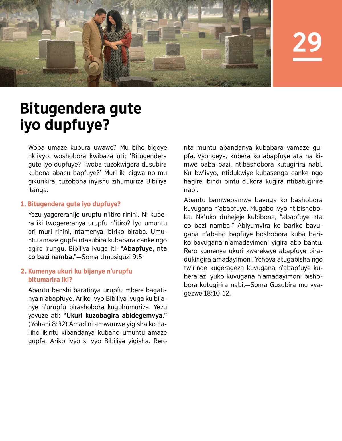 Woba umaze kubura uwawe? Mu bihe bigoye nk’ivyo, woshobora kwibaza uti: ‘Bitugendera gute iyo dupfuye? Twoba tuzokwigera dusubira kubona abacu bapfuye?’ Muri iki cigwa no mu gikurikira, tuzobona inyishu zihumuriza Bibiliya itanga.