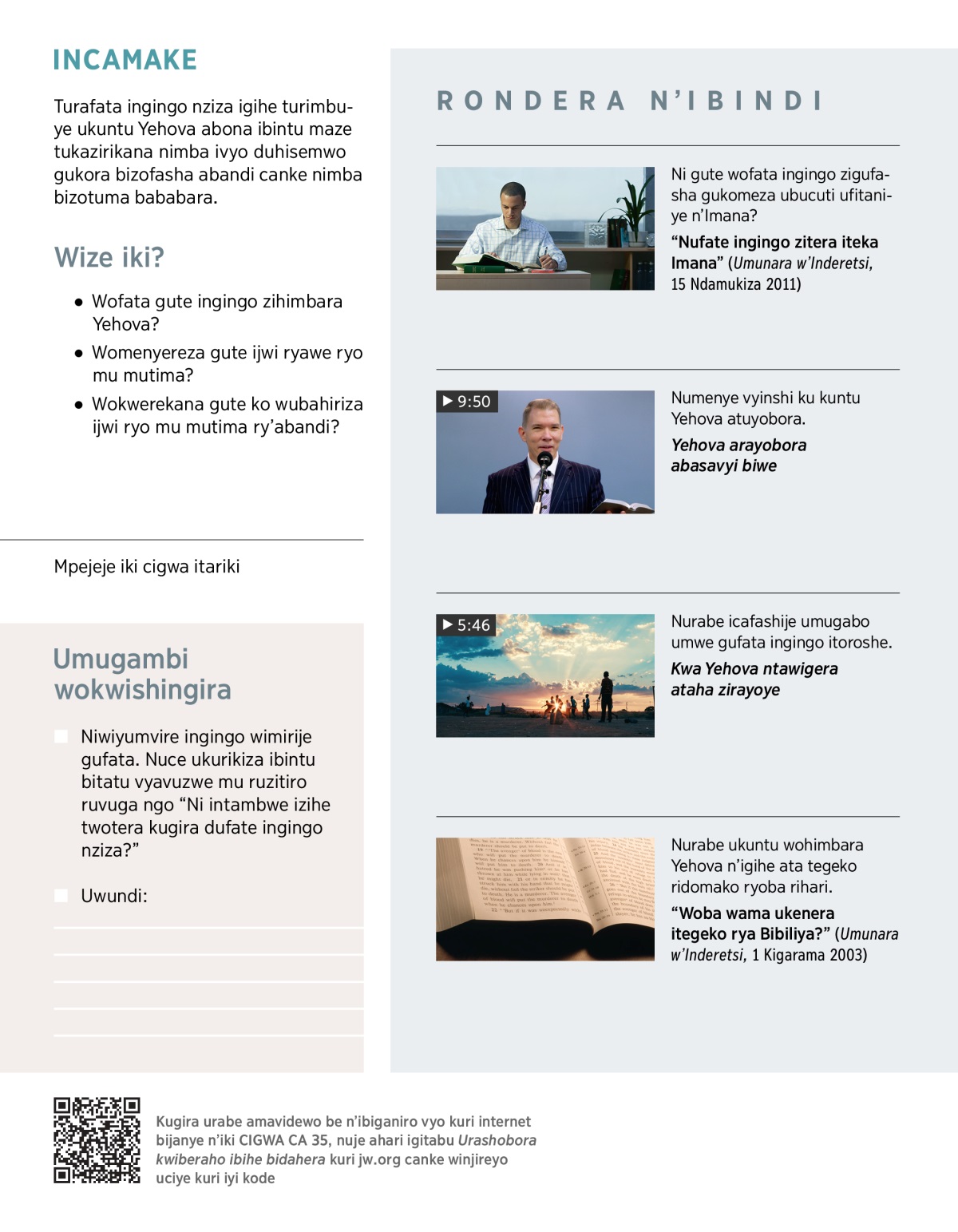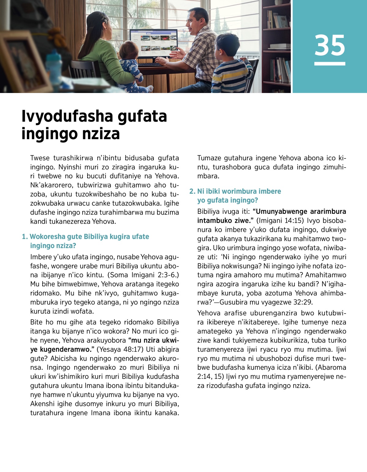 Twese turashikirwa n’ibintu bidusaba gufata ingingo. Nyinshi muri zo ziragira ingaruka kuri twebwe no ku bucuti dufitaniye na Yehova. Nk’akarorero, tubwirizwa guhitamwo aho tuzoba, ukuntu tuzokwibeshaho be no kuba tuzokwubaka urwacu canke tutazokwubaka. Igihe dufashe ingingo nziza turahimbarwa mu buzima kandi tukanezereza Yehova.