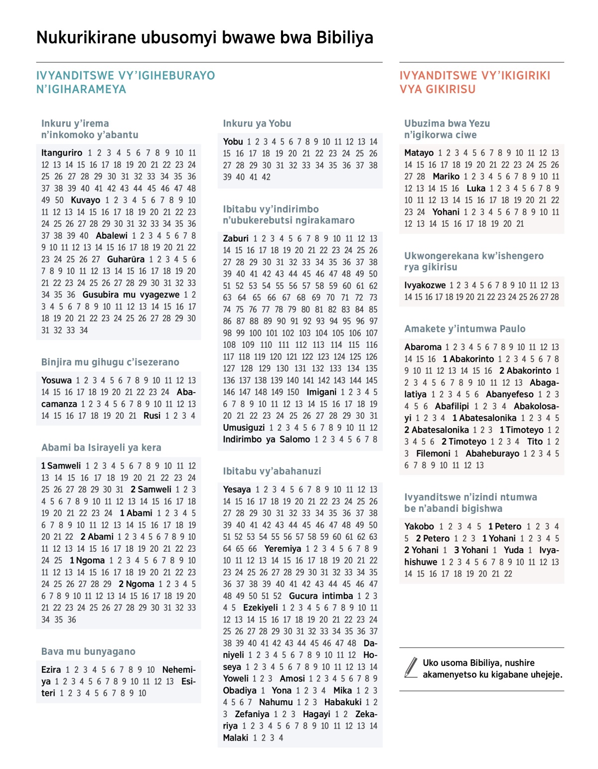 Nukurikirane ubusomyi bwawe bwa Bibiliya Integuro icapuwe Inkuru y’irema n’inkomoko y’abantu Binjira mu gihugu c’isezerano Abami ba Isirayeli ya kera Bava mu bunyagano Inkuru ya Yobu Ibitabu vy’indirimbo n’ubukerebutsi ngirakamaro Ibitabu vy’abahanuzi Ubuzima bwa Yezu n’igikorwa ciwe Ukwongerekana kw’ishengero rya gikirisu Amakete y’intumwa Paulo Ivyanditswe n’izindi ntumwa be n’abandi bigishwa Uko usoma Bibiliya, nushire akamenyetso ku kigabane uhejeje. IVYANDITSWE VY’IGIHEBURAYO N’IGIHARAMEYA Inkuru y’irema n’inkomoko y’abantu Itanguriro 1 2 3 4 5 6 7 8 9 10 11 12 13 14 15 16 17 18 19 20 21 22 23 24 25 26 27 28 29 30 31 32 33 34 35 36 37 38 39 40 41 42 43 44 45 46 47 48 49 50 Kuvayo 1 2 3 4 5 6 7 8 9 10 11 12 13 14 15 16 17 18 19 20 21 22 23 24 25 26 27 28 29 30 31 32 33 34 35 36 37 38 39 40 Abalewi 1 2 3 4 5 6 7 8 9 10 11 12 13 14 15 16 17 18 19 20 21 22 23 24 25 26 27 Guharūra 1 2 3 4 5 6 7 8 9 10 11 12 13 14 15 16 17 18 19 20 21 22 23 24 25 26 27 28 29 30 31 32 33 34 35 36 Gusubira mu vyagezwe 1 2 3 4 5 6 7 8 9 10 11 12 13 14 15 16 17 18 19 20 21 22 23 24 25 26 27 28 29 30 31 32 33 34 Binjira mu gihugu c’isezerano Yosuwa 1 2 3 4 5 6 7 8 9 10 11 12 13 14 15 16 17 18 19 20 21 22 23 24 Abacamanza 1 2 3 4 5 6 7 8 9 10 11 12 13 14 15 16 17 18 19 20 21 Rusi 1 2 3 4 Abami ba Isirayeli ya kera 1 Samweli 1 2 3 4 5 6 7 8 9 10 11 12 13 14 15 16 17 18 19 20 21 22 23 24 25 26 27 28 29 30 31 2 Samweli 1 2 3 4 5 6 7 8 9 10 11 12 13 14 15 16 17 18 19 20 21 22 23 24 1 Abami 1 2 3 4 5 6 7 8 9 10 11 12 13 14 15 16 17 18 19 20 21 22 2 Abami 1 2 3 4 5 6 7 8 9 10 11 12 13 14 15 16 17 18 19 20 21 22 23 24 25 1 Ngoma 1 2 3 4 5 6 7 8 9 10 11 12 13 14 15 16 17 18 19 20 21 22 23 24 25 26 27 28 29 2 Ngoma 1 2 3 4 5 6 7 8 9 10 11 12 13 14 15 16 17 18 19 20 21 22 23 24 25 26 27 28 29 30 31 32 33 34 35 36 Bava mu bunyagano Ezira 1 2 3 4 5 6 7 8 9 10 Nehemiya 1 2 3 4 5 6 7 8 9 10 11 12 13 Esiteri 1 2 3 4 5 6 7 8 9 10 Inkuru ya Yobu Yobu 1 2 3 4 5 6 7 8 9 10 11 12 13 14 15 16 17 18 19 20 21 22 23 24 25 26 27 28 29 30 31 32 33 34 35 36 37 38 39 40 41 42 Ibitabu vy’indirimbo n’ubukerebutsi ngirakamaro Zaburi 1 2 3 4 5 6 7 8 9 10 11 12 13 14 15 16 17 18 19 20 21 22 23 24 25 26 27 28 29 30 31 32 33 34 35 36 37 38 39 40 41 42 43 44 45 46 47 48 49 50 51 52 53 54 55 56 57 58 59 60 61 62 63 64 65 66 67 68 69 70 71 72 73 74 75 76 77 78 79 80 81 82 83 84 85 86 87 88 89 90 91 92 93 94 95 96 97 98 99 100 101 102 103 104 105 106 107 108 109 110 111 112 113 114 115 116 117 118 119 120 121 122 123 124 125 126 127 128 129 130 131 132 133 134 135 136 137 138 139 140 141 142 143 144 145 146 147 148 149 150 Imigani 1 2 3 4 5 6 7 8 9 10 11 12 13 14 15 16 17 18 19 20 21 22 23 24 25 26 27 28 29 30 31 Umusiguzi 1 2 3 4 5 6 7 8 9 10 11 12 Indirimbo ya Salomo 1 2 3 4 5 6 7 8 Ibitabu vy’abahanuzi Yesaya 1 2 3 4 5 6 7 8 9 10 11 12 13 14 15 16 17 18 19 20 21 22 23 24 25 26 27 28 29 30 31 32 33 34 35 36 37 38 39 40 41 42 43 44 45 46 47 48 49 50 51 52 53 54 55 56 57 58 59 60 61 62 63 64 65 66 Yeremiya 1 2 3 4 5 6 7 8 9 10 11 12 13 14 15 16 17 18 19 20 21 22 23 24 25 26 27 28 29 30 31 32 33 34 35 36 37 38 39 40 41 42 43 44 45 46 47 48 49 50 51 52 Gucura intimba 1 2 3 4 5 Ezekiyeli 1 2 3 4 5 6 7 8 9 10 11 12 13 14 15 16 17 18 19 20 21 22 23 24 25 26 27 28 29 30 31 32 33 34 35 36 37 38 39 40 41 42 43 44 45 46 47 48 Daniyeli 1 2 3 4 5 6 7 8 9 10 11 12 Hoseya 1 2 3 4 5 6 7 8 9 10 11 12 13 14 Yoweli 1 2 3 Amosi 1 2 3 4 5 6 7 8 9 Obadiya 1 Yona 1 2 3 4 Mika 1 2 3 4 5 6 7 Nahumu 1 2 3 Habakuki 1 2 3 Zefaniya 1 2 3 Hagayi 1 2 Zekariya 1 2 3 4 5 6 7 8 9 10 11 12 13 14 Malaki 1 2 3 4 IVYANDITSWE VY’IKIGIRIKI VYA GIKIRISU Ubuzima bwa Yezu n’igikorwa ciwe Matayo 1 2 3 4 5 6 7 8 9 10 11 12 13 14 15 16 17 18 19 20 21 22 23 24 25 26 27 28 Mariko 1 2 3 4 5 6 7 8 9 10 11 12 13 14 15 16 Luka 1 2 3 4 5 6 7 8 9 10 11 12 13 14 15 16 17 18 19 20 21 22 23 24 Yohani 1 2 3 4 5 6 7 8 9 10 11 12 13 14 15 16 17 18 19 20 21 Ukwongerekana kw’ishengero rya gikirisu Ivyakozwe 1 2 3 4 5 6 7 8 9 10 11 12 13 14 15 16 17 18 19 20 21 22 23 24 25 26 27 28 Amakete y’intumwa Paulo Abaroma 1 2 3 4 5 6 7 8 9 10 11 12 13 14 15 16 1 Abakorinto 1 2 3 4 5 6 7 8 9 10 11 12 13 14 15 16 2 Abakorinto 1 2 3 4 5 6 7 8 9 10 11 12 13 Abagalatiya 1 2 3 4 5 6 Abanyefeso 1 2 3 4 5 6 Abafilipi 1 2 3 4 Abakolosayi 1 2 3 4 1 Abatesalonika 1 2 3 4 5 2 Abatesalonika 1 2 3 1 Timoteyo 1 2 3 4 5 6 2 Timoteyo 1 2 3 4 Tito 1 2 3 Filemoni 1 Abaheburayo 1 2 3 4 5 6 7 8 9 10 11 12 13 Ivyanditswe n’izindi ntumwa be n’abandi bigishwa Yakobo 1 2 3 4 5 1 Petero 1 2 3 4 5 2 Petero 1 2 3 1 Yohani 1 2 3 4 5 2 Yohani 1 3 Yohani 1 Yuda 1 Ivyahishuwe 1 2 3 4 5 6 7 8 9 10 11 12 13 14 15 16 17 18 19 20 21 22
