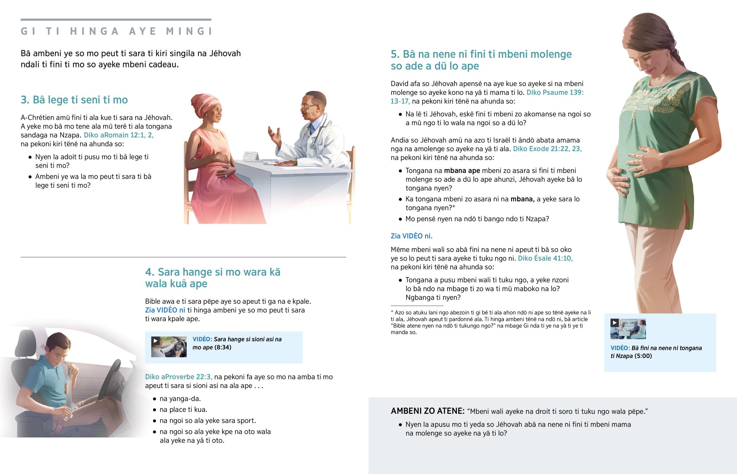 Na ngoi so a mû ngo ti mo, Jéhovah apensé na mo. Yingo ti Nzapa apusu David, mbeni wakua ti lo, ti tene na lo: “Lê ti mo abâ mbi même na ngoi so mbi ngbâ gï mênë.” (Psaume 139:16). Jéhovah abâ fini ti mo na nene ni mingi. (Diko Matthieu 10:29-31.) Tongana mbeni zo afâ mbeni zo na mbana wala lo fâ même terê ti lo, a yeke son Jéhovah mingi (Exode 20:13).a Tongana e zia fini ti e senge senge na yâ ti kpale wala e sara ye na hange ape ti bata fini ti azo, a yeke son nga Jéhovah. Tongana e bâ lege ti e wani nzoni nga e bâ na nene ni fini ti azo, e yeke fa so e kiri singila ndali ti fini so ayeke pendere cadeau so e yeke na ni.
