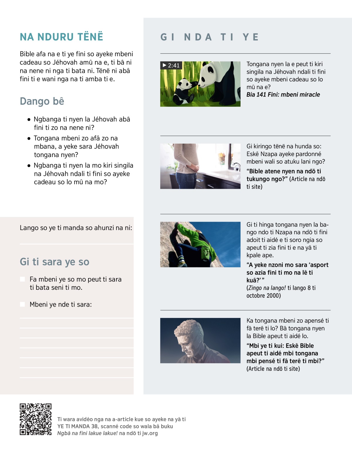 Bible awa e ti sara pëpe aye so apeut ti ga na e kpale. Zia VIDÉO ni ti hinga ambeni ye so mo peut ti sara ti wara kpale ape.
