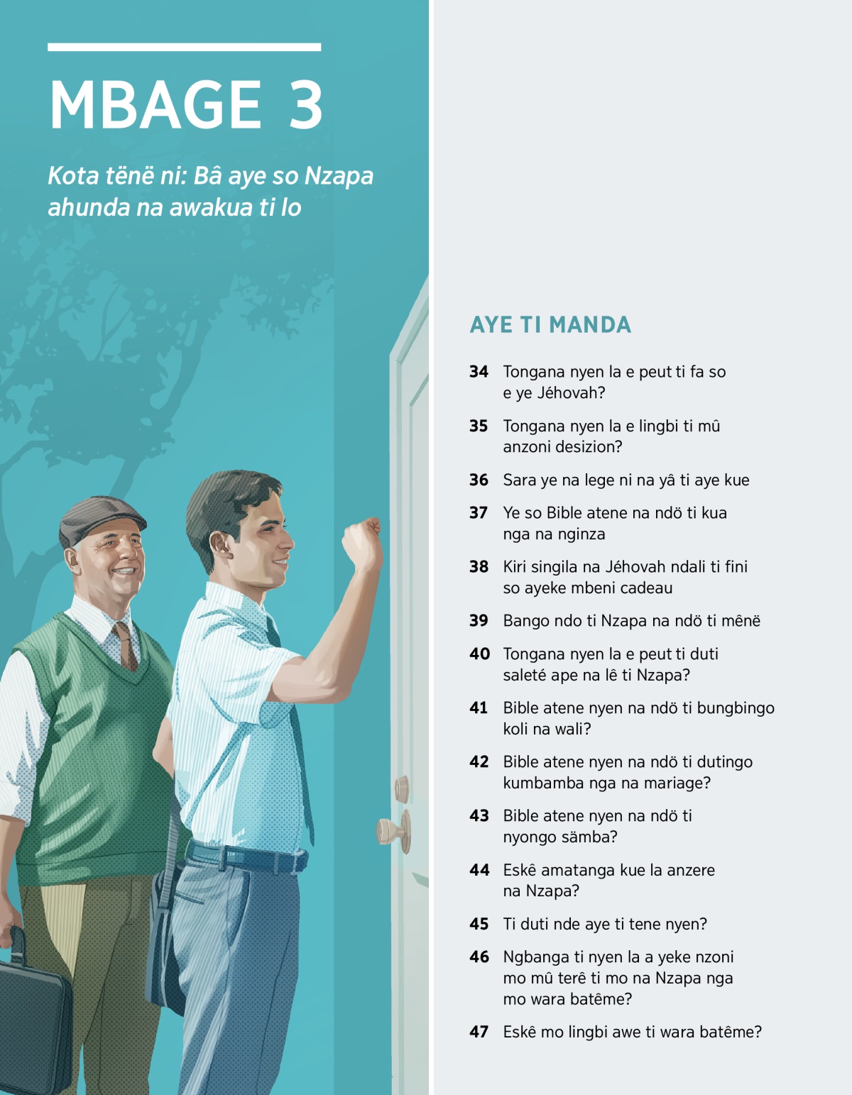 Mbage 3 Ti so a-imprimé ni Kota tënë ni: Bâ aye so Nzapa ahunda na awakua ti lo AYE TI MANDA 34 Tongana nyen la e peut ti fa so e ye Jéhovah? 35 Tongana nyen la e lingbi ti mû anzoni desizion? 36 Sara ye na lege ni na yâ ti aye kue 37 Ye so Bible atene na ndö ti kua nga na nginza 38 Kiri singila na Jéhovah ndali ti fini so ayeke mbeni cadeau 39 Bango ndo ti Nzapa na ndö ti mênë 40 Tongana nyen la e peut ti duti saleté ape na lê ti Nzapa? 41 Bible atene nyen na ndö ti bungbingo koli na wali? 42 Bible atene nyen na ndö ti dutingo kumbamba nga na mariage? 43 Bible atene nyen na ndö ti nyongo sämba? 44 Eskê amatanga kue la anzere na Nzapa? 45 Ti duti nde aye ti tene nyen 46 Ngbanga ti nyen la a yeke nzoni mo mû terê ti mo na Nzapa nga mo wara batême? 47 Eskê mo lingbi awe ti wara batême?