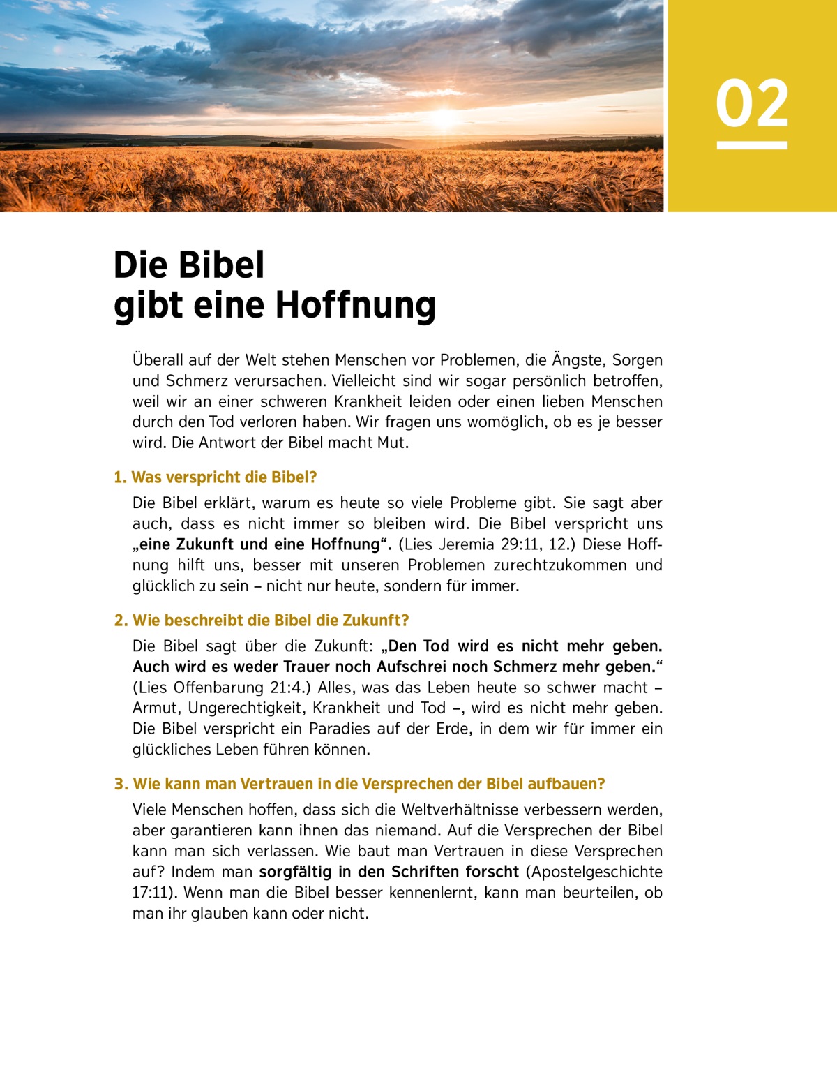 Die Zukunftshoffnung der Bibel gibt uns neue Kraft, wenn wir mutlos sind, und hilft uns, mit Problemen besser zurechtzukommen. Lies Sprüche 17:22 und Römer 12:12. Dazu die Fragen: