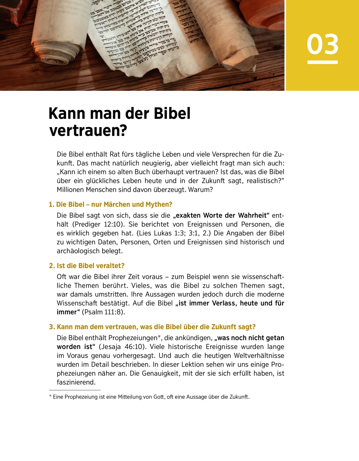 Die Bibel enthält Rat fürs tägliche Leben und viele Versprechen für die Zukunft. Das macht natürlich neugierig, aber vielleicht fragt man sich auch: „Kann ich einem so alten Buch überhaupt vertrauen? Ist das, was die Bibel über ein glückliches Leben heute und in der Zukunft sagt, realistisch?“ Millionen Menschen sind davon überzeugt. Warum?