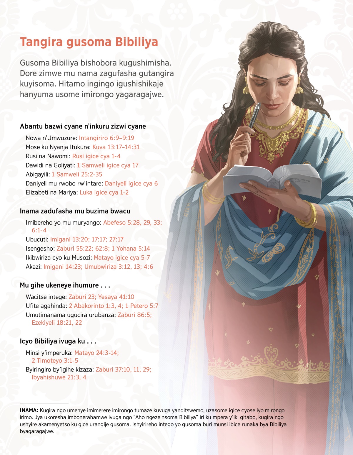 INAMA: Kugira ngo umenye imimerere imirongo tumaze kuvuga yanditswemo, uzasome igice cyose iyo mirongo irimo. Jya ukoresha imbonerahamwe ivuga ngo “Aho ngeze nsoma Bibiliya” iri ku mpera y’iki gitabo, kugira ngo ushyire akamenyetso ku gice urangije gusoma. Ishyirireho intego yo gusoma buri munsi ibice runaka bya Bibiliya byagaragajwe.