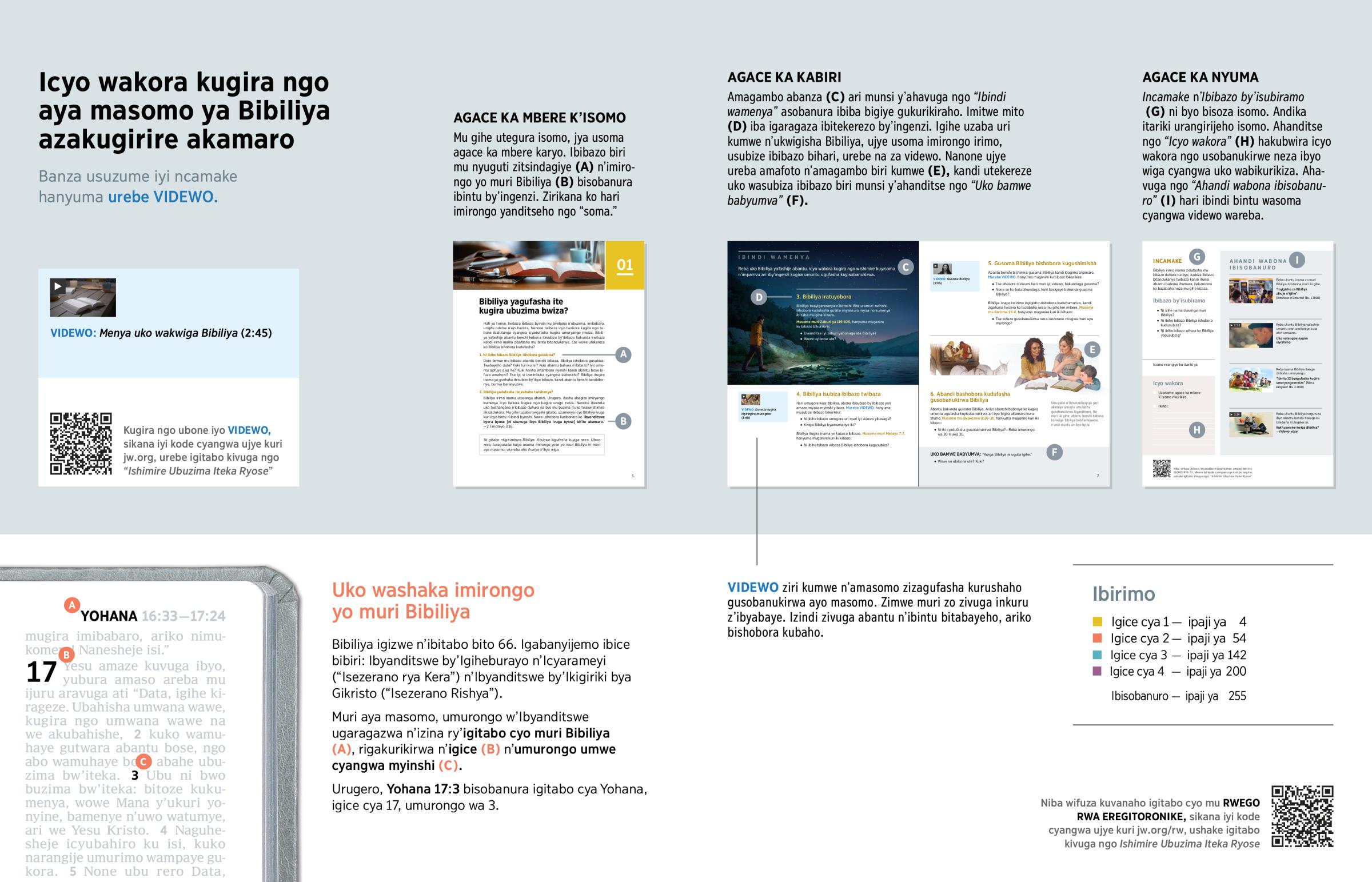 Amagambo abanza (C) ari munsi y’ahavuga ngo “Ibindi wamenya” asobanura ibiba bigiye gukurikiraho. Imitwe mito (D) iba igaragaza ibitekerezo by’ingenzi. Igihe uzaba uri kumwe n’ukwigisha Bibiliya, ujye usoma imirongo irimo, usubize ibibazo bihari, urebe na za videwo.