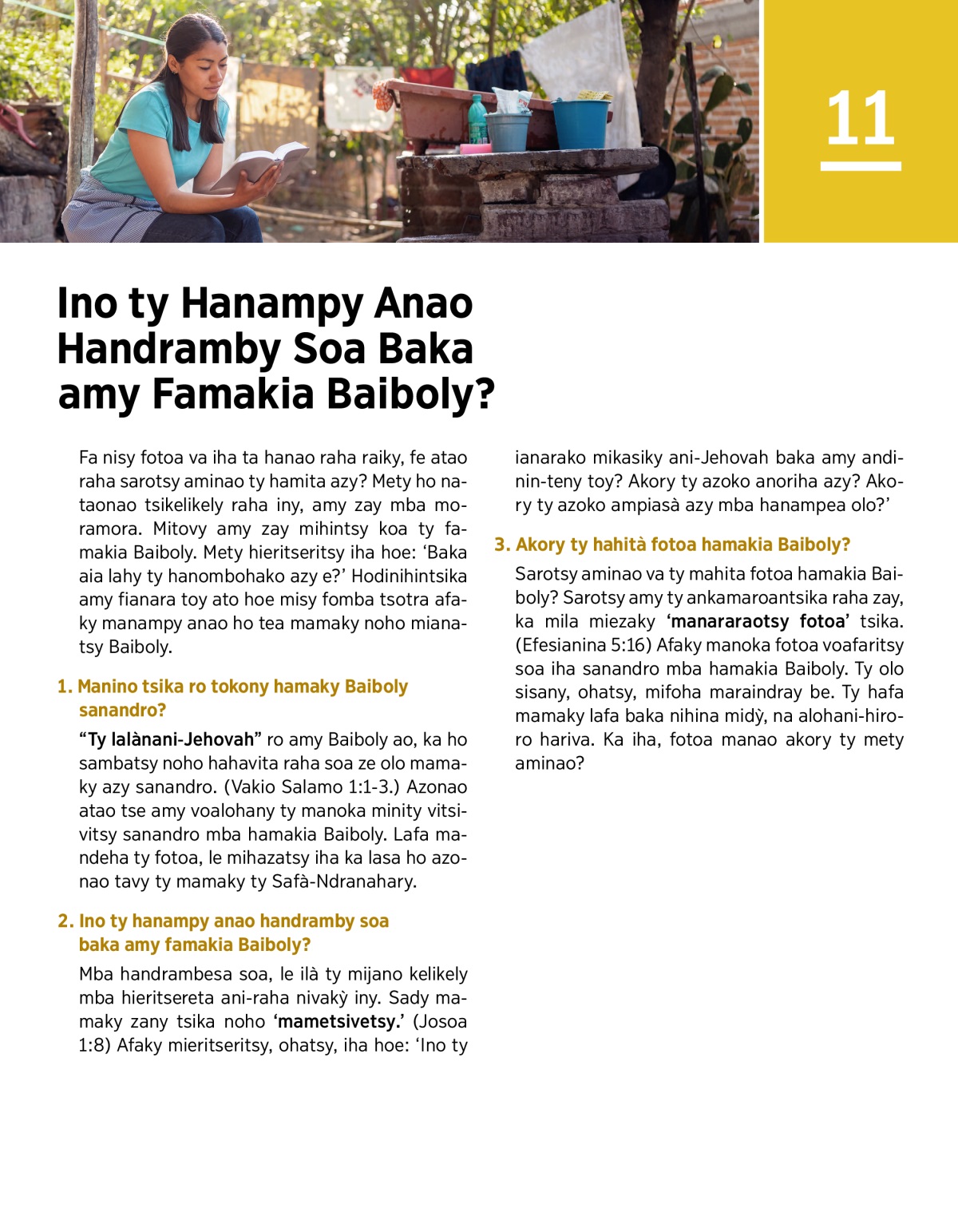 Sarotsy aminao va ty mahita fotoa hamakia Baiboly? Sarotsy amy ty ankamaroantsika raha zay, ka mila miezaky ‘manararaotsy fotoa’ tsika. (Efesianina 5:16) Afaky manoka fotoa voafaritsy soa iha sanandro mba hamakia Baiboly. Ty olo sisany, ohatsy, mifoha maraindray be. Ty hafa mamaky lafa baka nihina midỳ, na alohani-hiroro hariva. Ka iha, fotoa manao akory ty mety aminao?