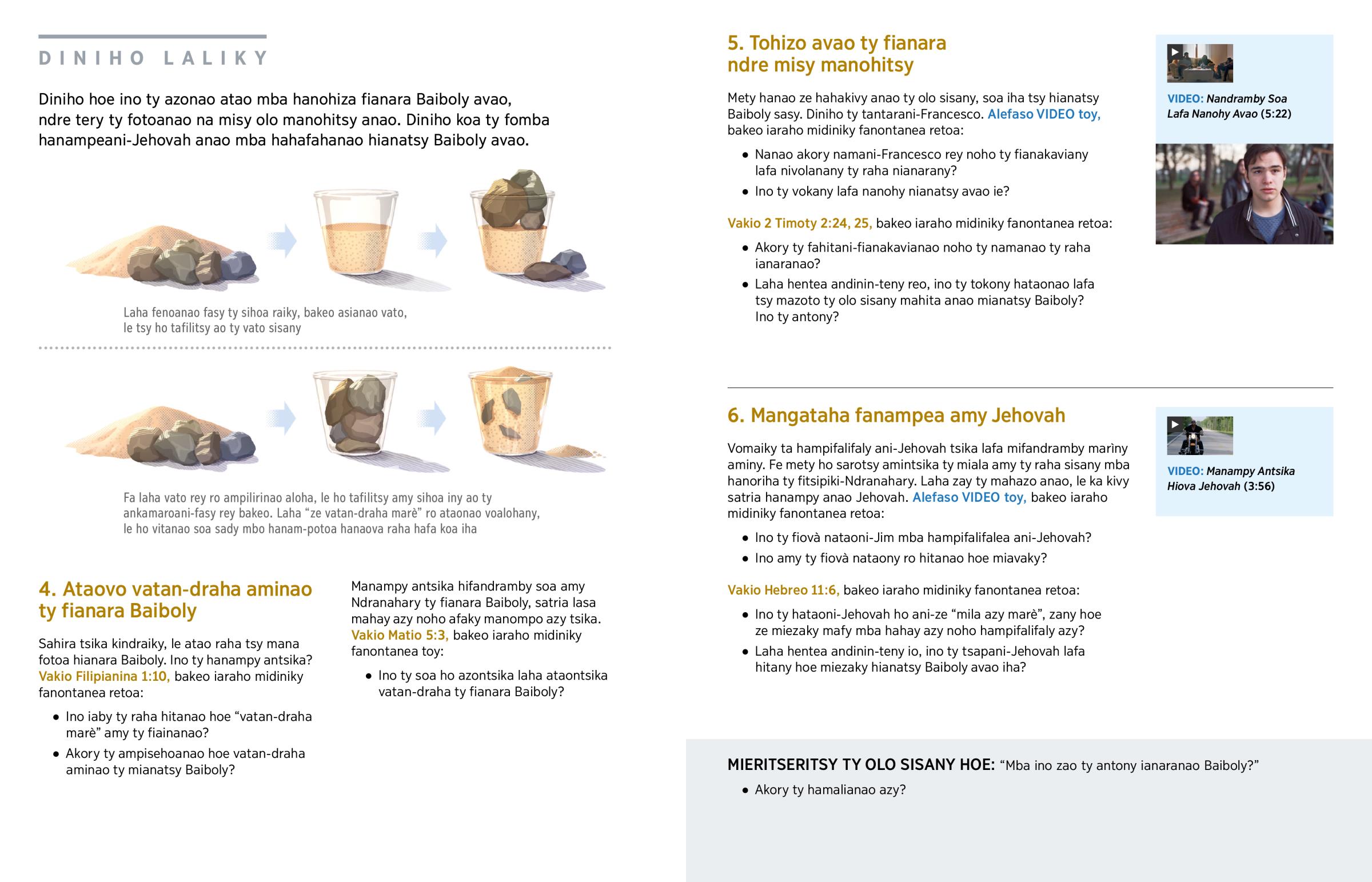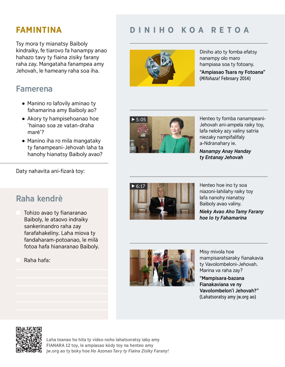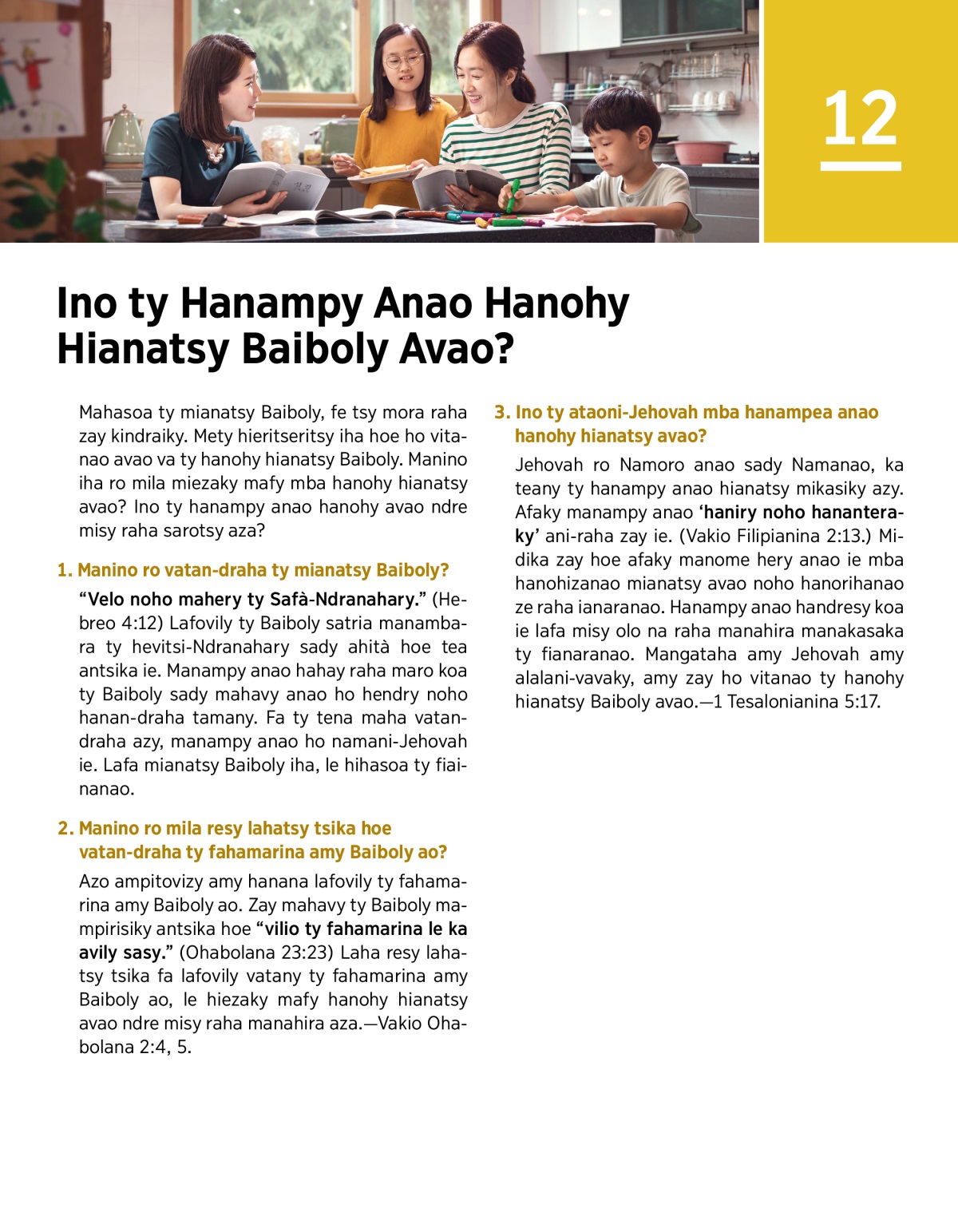 Tsy mora ty mianatsy Baiboly kindraiky, fe tiarovo fa hanampy anao hahazo tavy ty fiaina zisiky farany raha zay. Mangataha fanampea amy Jehovah, le hameany raha soa iha.