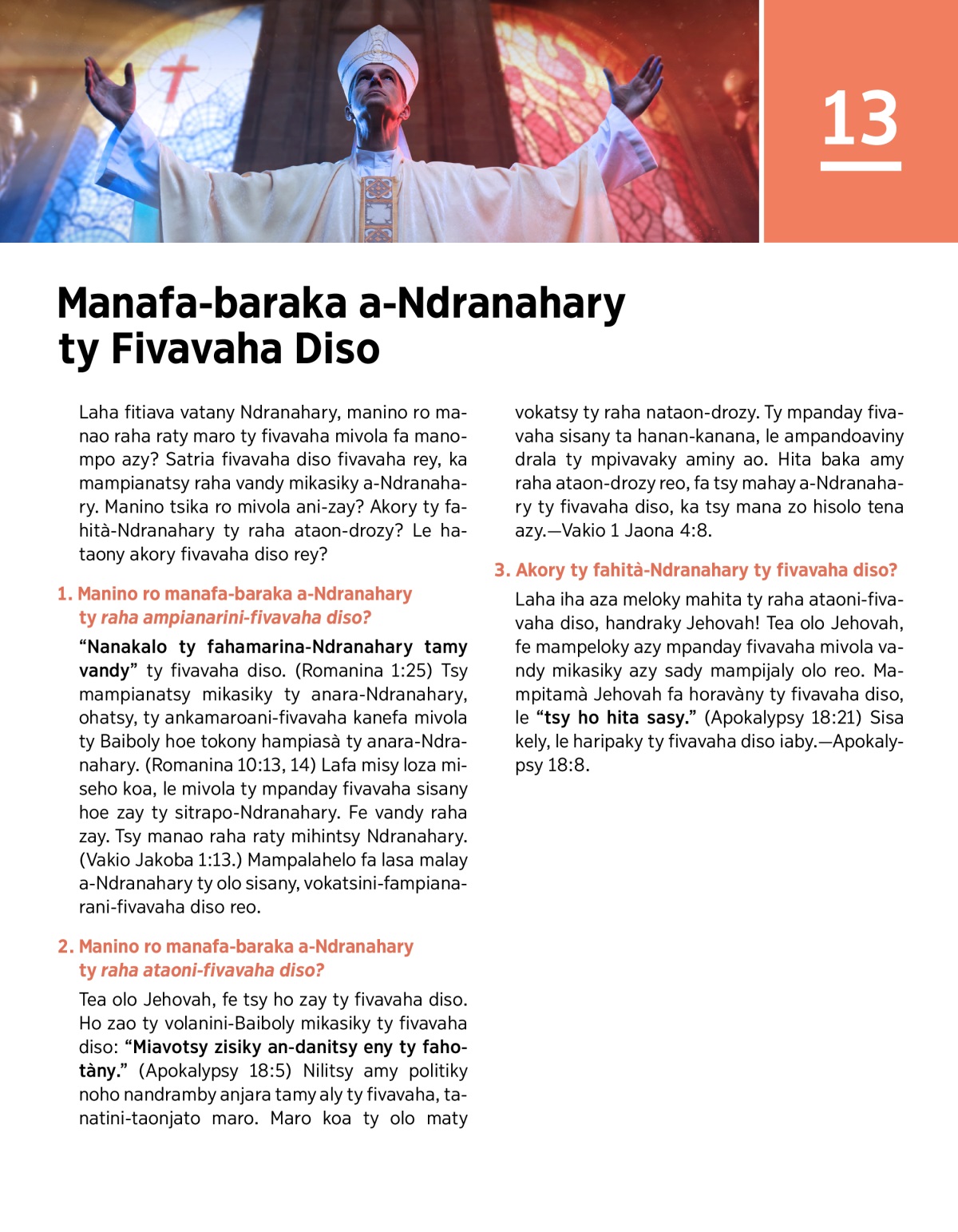 Ianaro marerè hoe manao akory ty fahità-Ndranahary ty fivavaha diso. Diniho koa ty raha ataon-drozy, le manino raha rezay ro tsy tokony henganao hampijano ty fianaranao Baiboly.