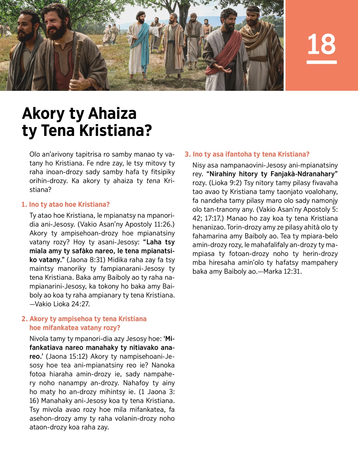 Ty atao hoe Kristiana, le mpianatsy na mpanori-dia ani-Jesosy. (Vakio Asan’ny Apostoly 11:26.) Akory ty ampisehoan-drozy hoe mpianatsiny vatany rozy? Hoy ty asani-Jesosy: “Laha tsy miala amy ty safàko nareo, le tena mpianatsiko vatany.” (Jaona 8:31) Midika raha zay fa tsy maintsy manoriky ty fampianarani-Jesosy ty tena Kristiana. Baka amy Baiboly ao ty raha nampianarini-Jesosy, ka tokony ho baka amy Baiboly ao koa ty raha ampianary ty tena Kristiana.—Vakio Lioka 24:27.