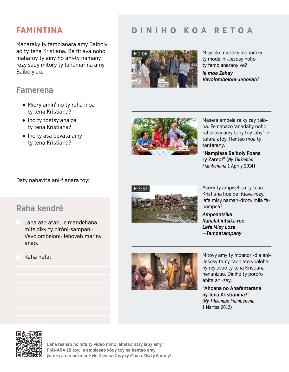 Manaraky ty fampianara amy Baiboly ao ty tena Kristiana. Be fitiava noho mahafoy ty ainy ho ahi-ty namany rozy sady mitory ty fahamarina amy Baiboly ao.