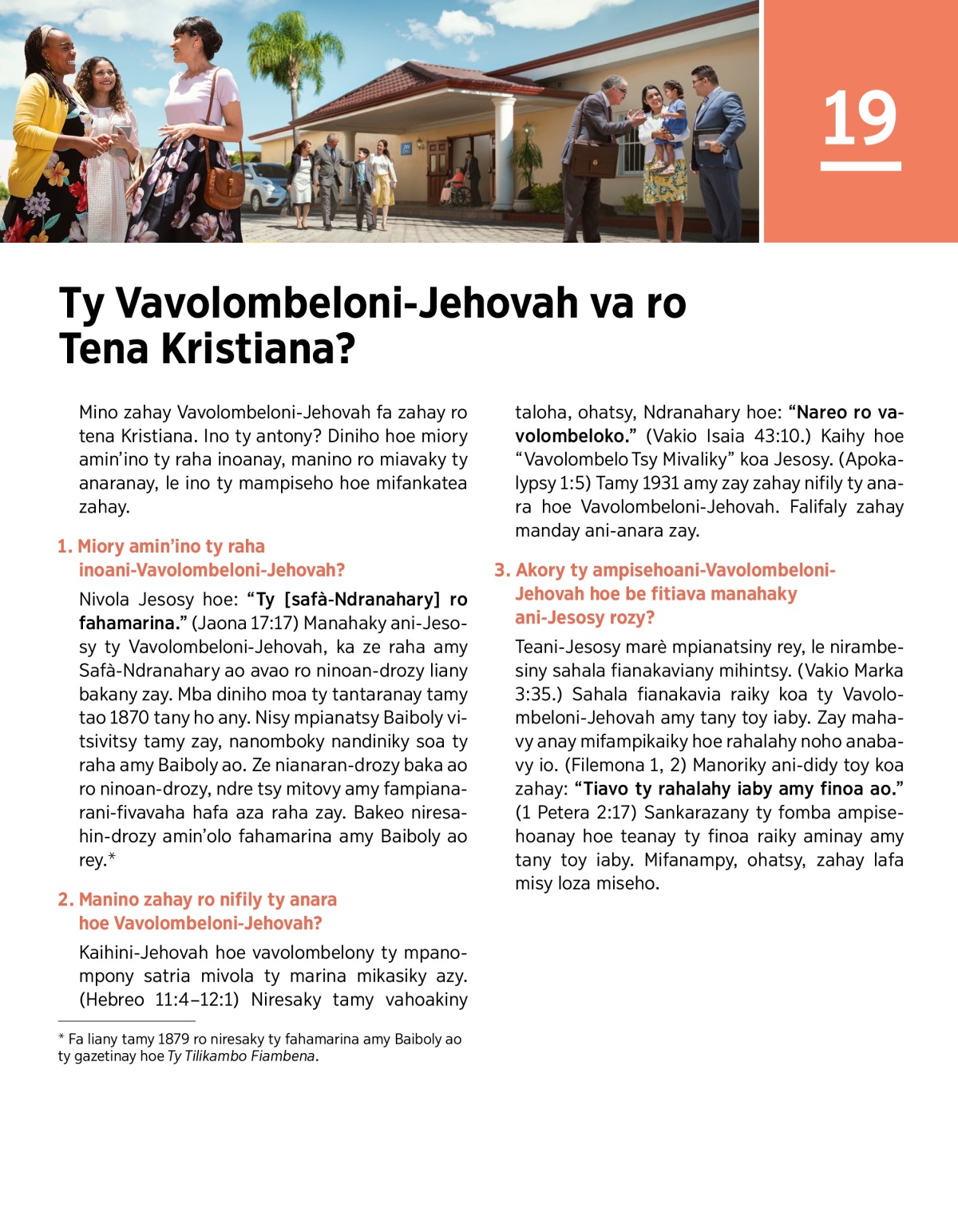 Ty Vavolombeloni-Jehovah ro tena Kristiana. Fianakavia raiky miparitaky amy tany toy iaby zahay. Miory amy Baiboly ty raha inoanay sady ambaranay amin’olo ty marina mikasiky ani-Jehovah.