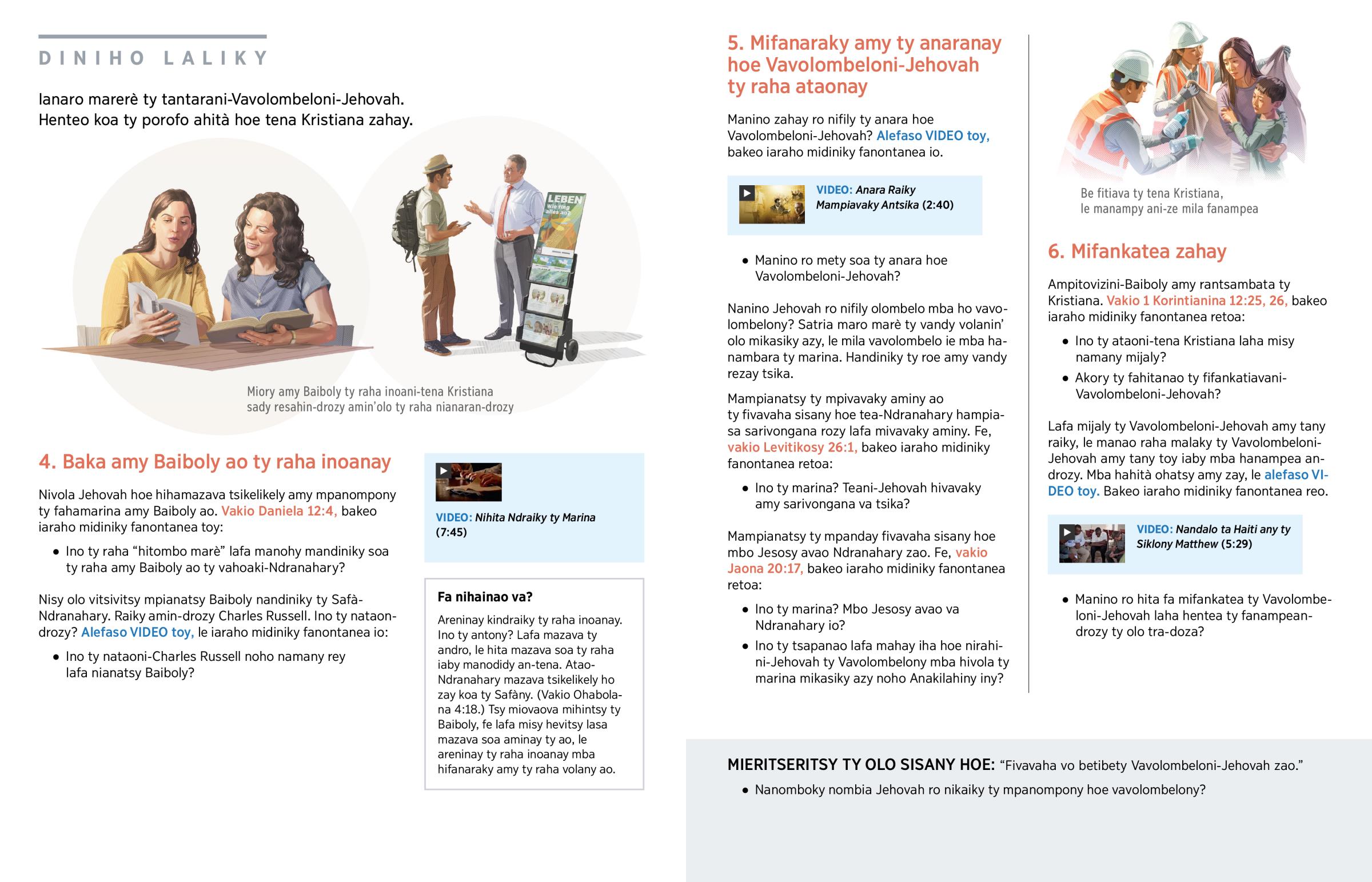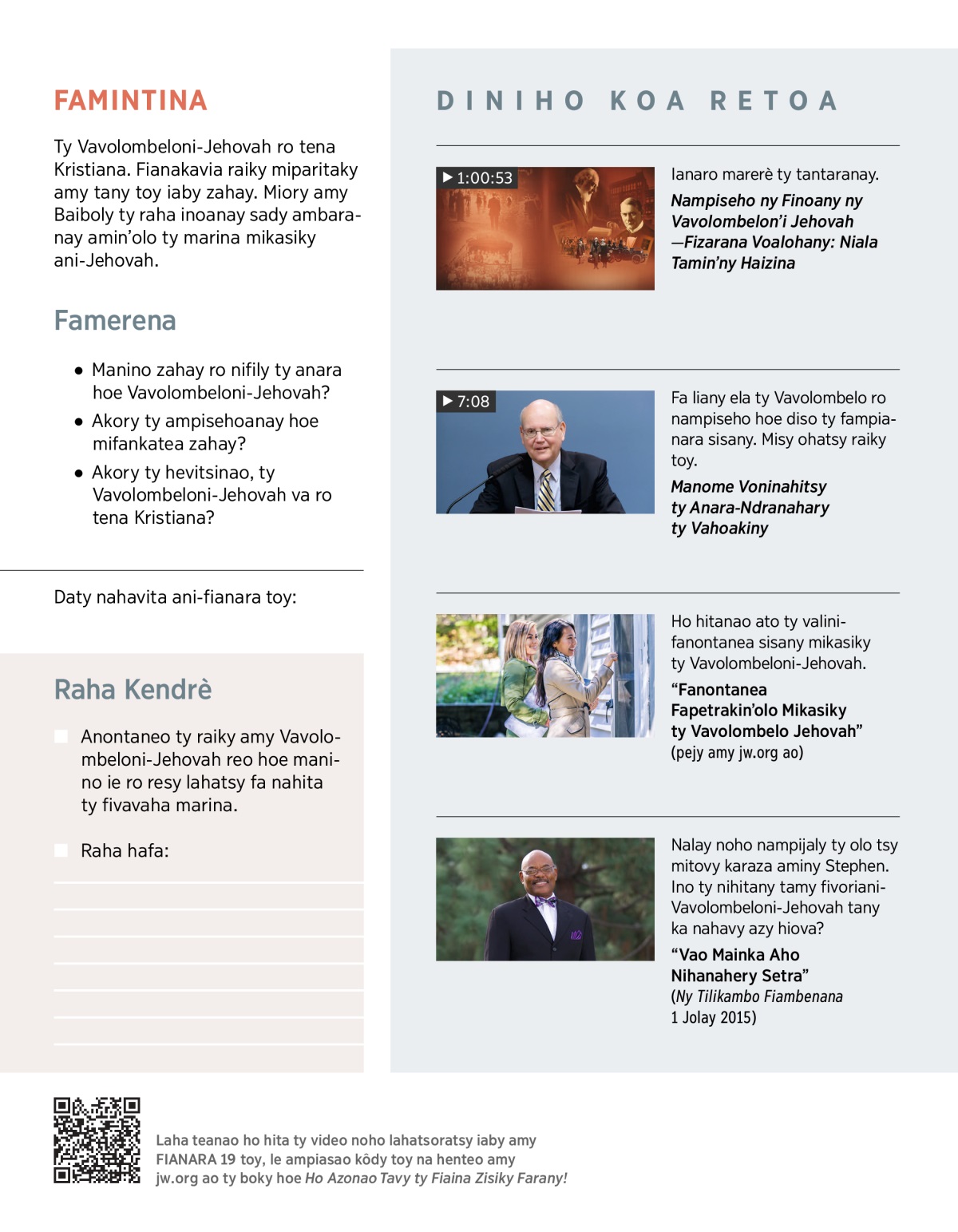 Lafa mijaly ty Vavolombeloni-Jehovah amy tany raiky, le manao raha malaky ty Vavolombeloni-Jehovah amy tany toy iaby mba hanampea an-drozy. Mba hahità ohatsy amy zay, le alefaso VIDEO toy. Bakeo iaraho midiniky fanontanea reo.