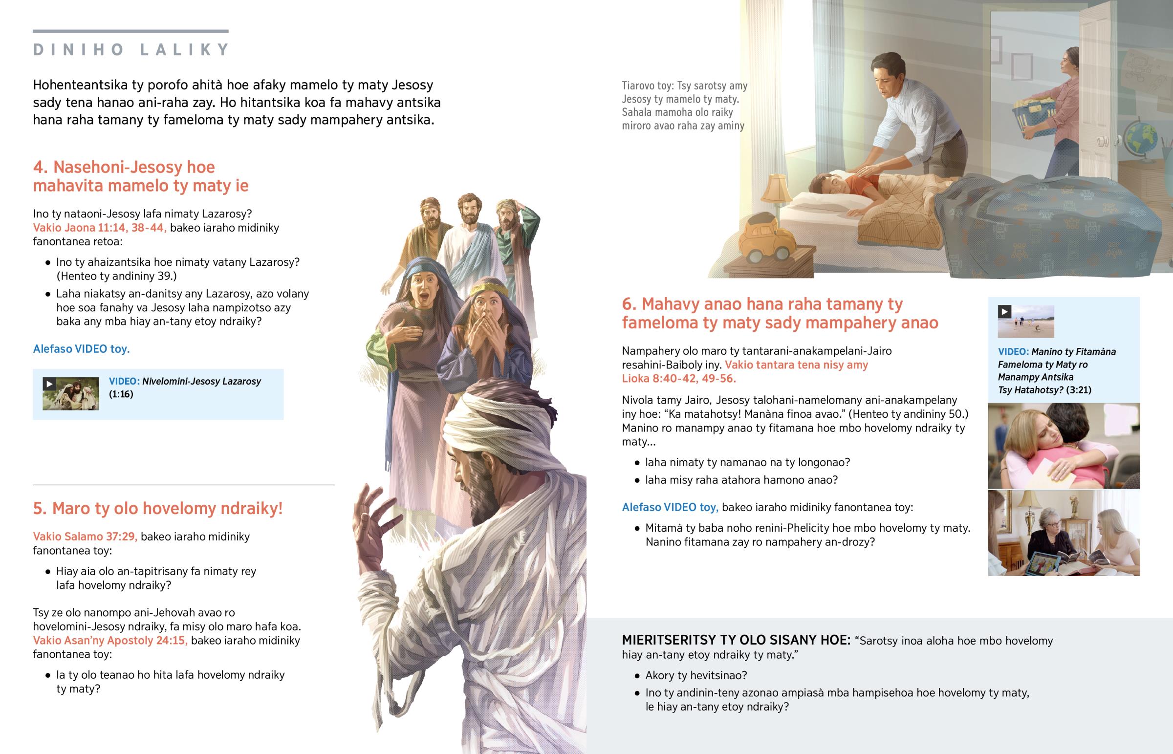 Nivola tamy Jairo, Jesosy talohani-namelomany ani-anakampelany iny hoe: “Ka matahotsy! Manàna finoa avao.” (Henteo ty andininy 50.) Manino ro manampy anao ty fitamana hoe mbo hovelomy ndraiky ty maty...