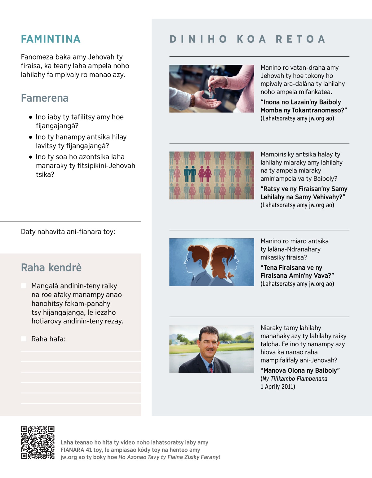 Niaraky tamy lahilahy manahaky azy ty lahilahy raiky taloha. Fe ino ty nanampy azy hiova ka nanao raha mampifalifaly ani-Jehovah?