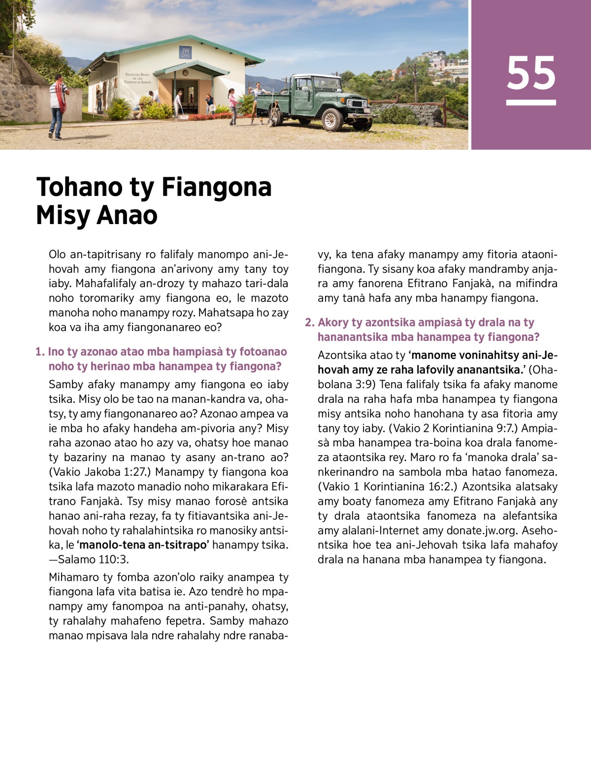 Olo an-tapitrisany ro falifaly manompo ani-Jehovah amy fiangona an’arivony amy tany toy iaby. Mahafalifaly an-drozy ty mahazo tari-dala noho toromariky amy fiangona eo, le mazoto manoha noho manampy rozy. Mahatsapa ho zay koa va iha amy fiangonanareo eo?