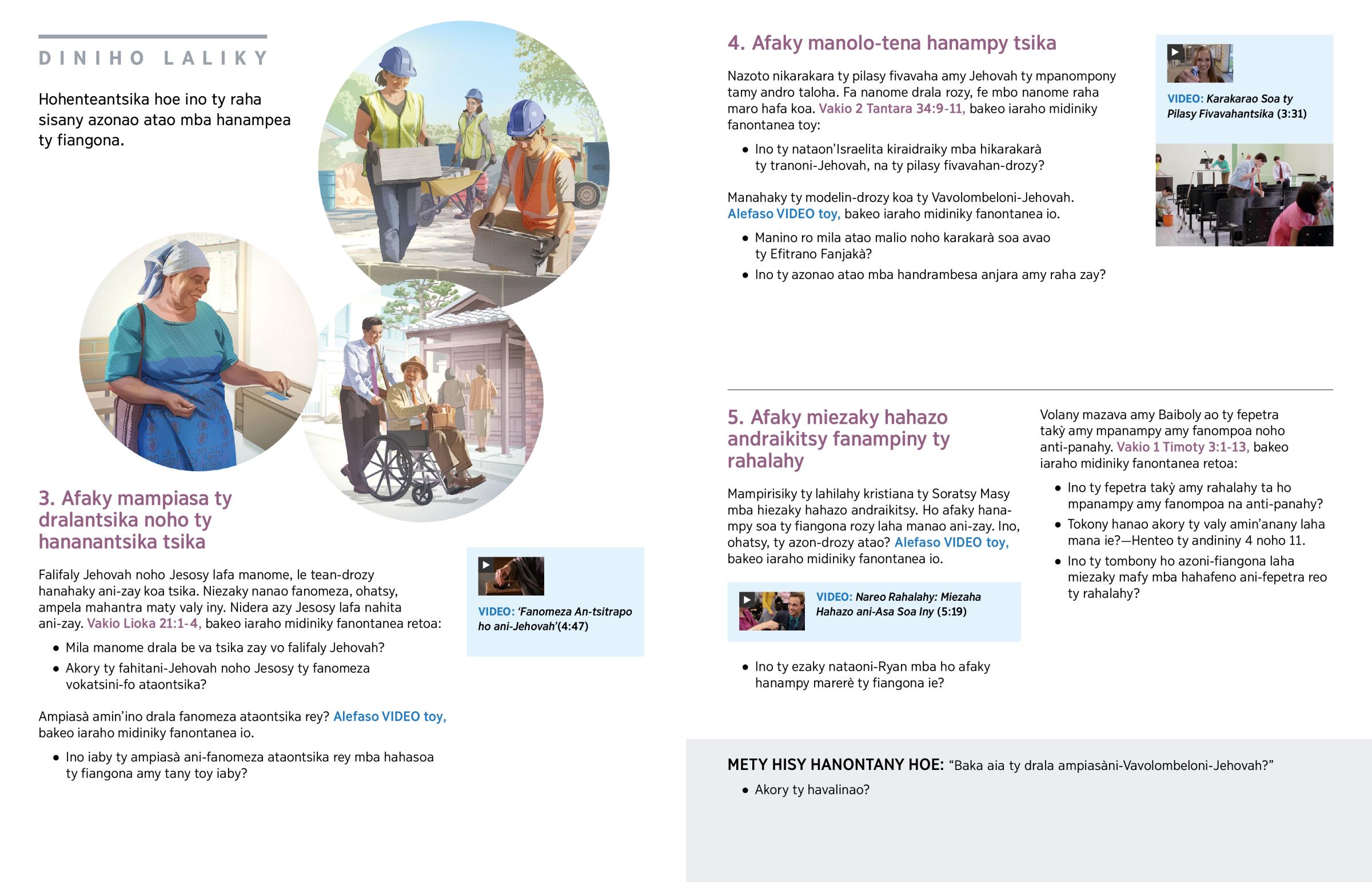 Samby afaky manampy amy fiangona eo iaby tsika. Misy olo be tao na manan-kandra va, ohatsy, ty amy fiangonanareo ao? Azonao ampea va ie mba ho afaky handeha am-pivoria any? Misy raha azonao atao ho azy va, ohatsy hoe manao ty bazariny na manao ty asany an-trano ao? (Vakio Jakoba 1:27.) Manampy ty fiangona koa tsika lafa mazoto manadio noho mikarakara Efitrano Fanjakà. Tsy misy manao forosè antsika hanao ani-raha rezay, fa ty fitiavantsika ani-Jehovah noho ty rahalahintsika ro manosiky antsika, le ‘manolo-tena an-tsitrapo’ hanampy tsika.—Salamo 110:3.