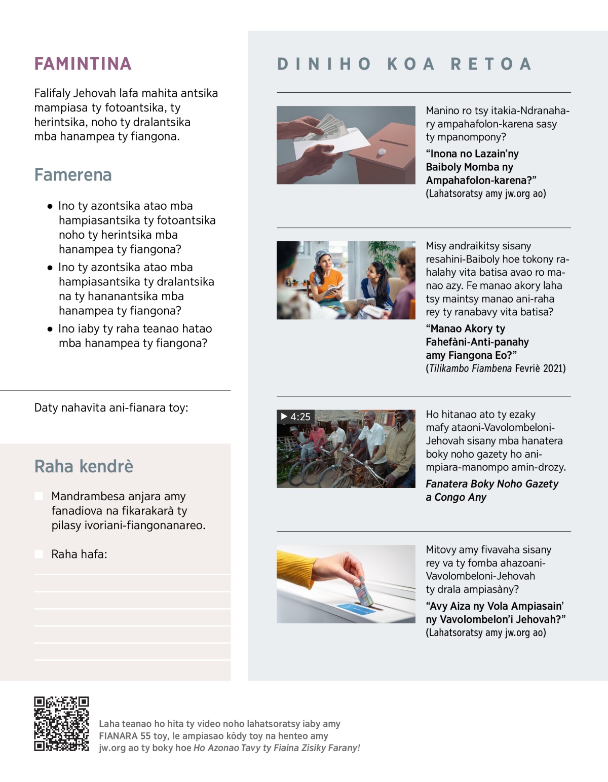 Azontsika atao ty ‘manome voninahitsy ani-Jehovah amy ze raha lafovily ananantsika.’ (Ohabolana 3:9) Tena falifaly tsika fa afaky manome drala na raha hafa mba hanampea ty fiangona misy antsika noho hanohana ty asa fitoria amy tany toy iaby. (Vakio 2 Korintianina 9:7.) Ampiasà mba hanampea tra-boina koa drala fanomeza ataontsika rey. Maro ro fa ‘manoka drala’ sankerinandro na sambola mba hatao fanomeza. (Vakio 1 Korintianina 16:2.) Azontsika alatsaky amy boaty fanomeza amy Efitrano Fanjakà any ty drala ataontsika fanomeza na alefantsika amy alalani-Internet amy donate.jw.org. Asehontsika hoe tea ani-Jehovah tsika lafa mahafoy drala na hanana mba hanampea ty fiangona.