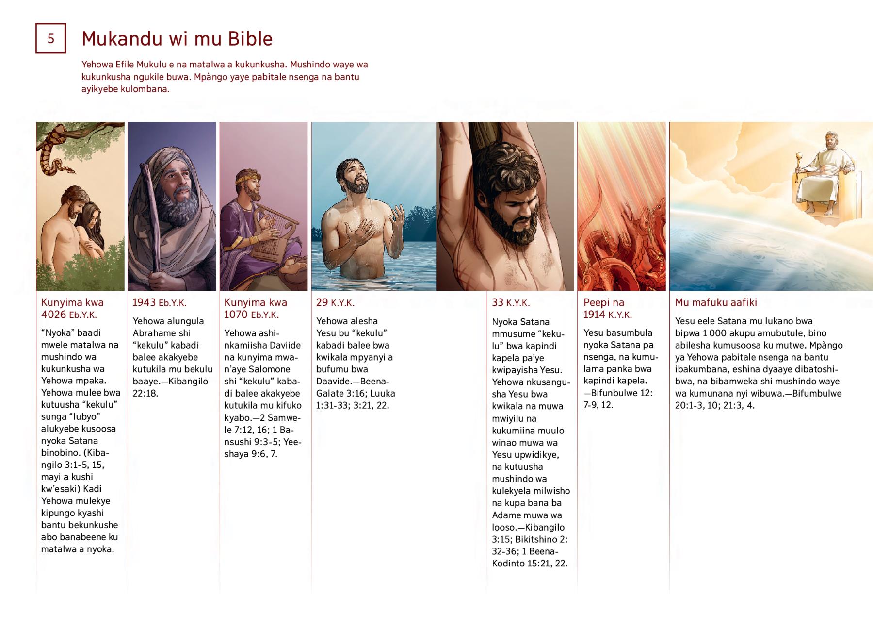Kunyima kwa 4026 Eb.Y.K. “Nyoka” baadi mwele matalwa na mushindo wa kukunkusha wa Yehowa mpaka. Yehowa mulee bwa kutuusha “kekulu” sunga “lubyo” alukyebe kusoosa nyoka Satana binobino. (Kibangilo 3:1-5, 15, mayi a kushi kw’esaki) Kadi Yehowa mulekye kipungo kyashi bantu bekunkushe abo banabeene ku matalwa a nyoka. |