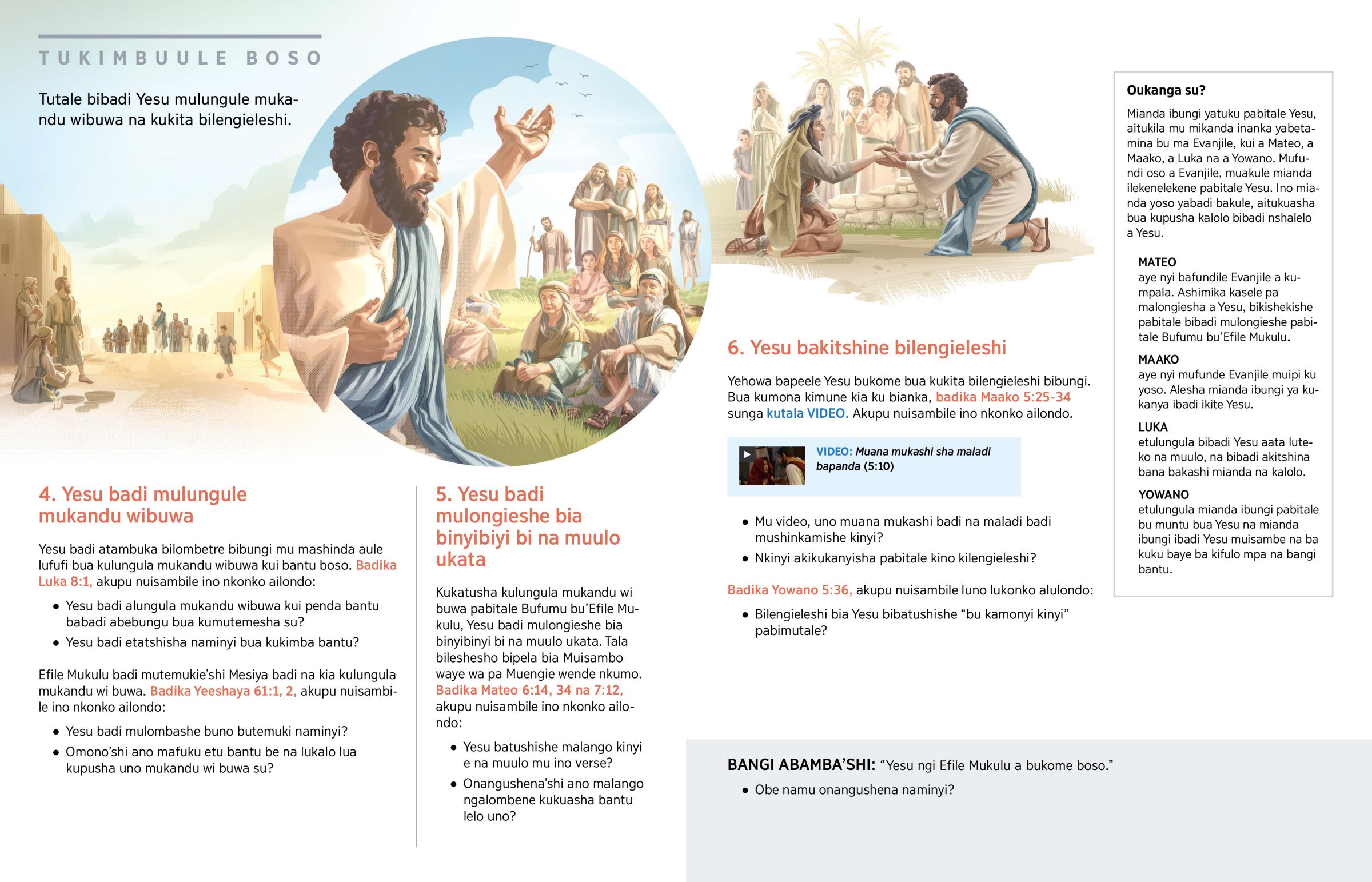 Mudimo ukata ubadi nao Yesu ubadi wa “kulungula mukandu wibuwa w’Efile Mukulu.” (Badika Luka 4:43.) Badi alungula mukandu wibuwa wa’shi: Efile Mukulu akatulu Bufumu sunga mbulamatadi akapudisha mianda yoso aikalakasha bantu.a Munda mua bipua bisatu na kipindi, Yesu bafubile ngofu bua kulungula bantu uno mukandu awibanyingisha.—Mateo 9:35.