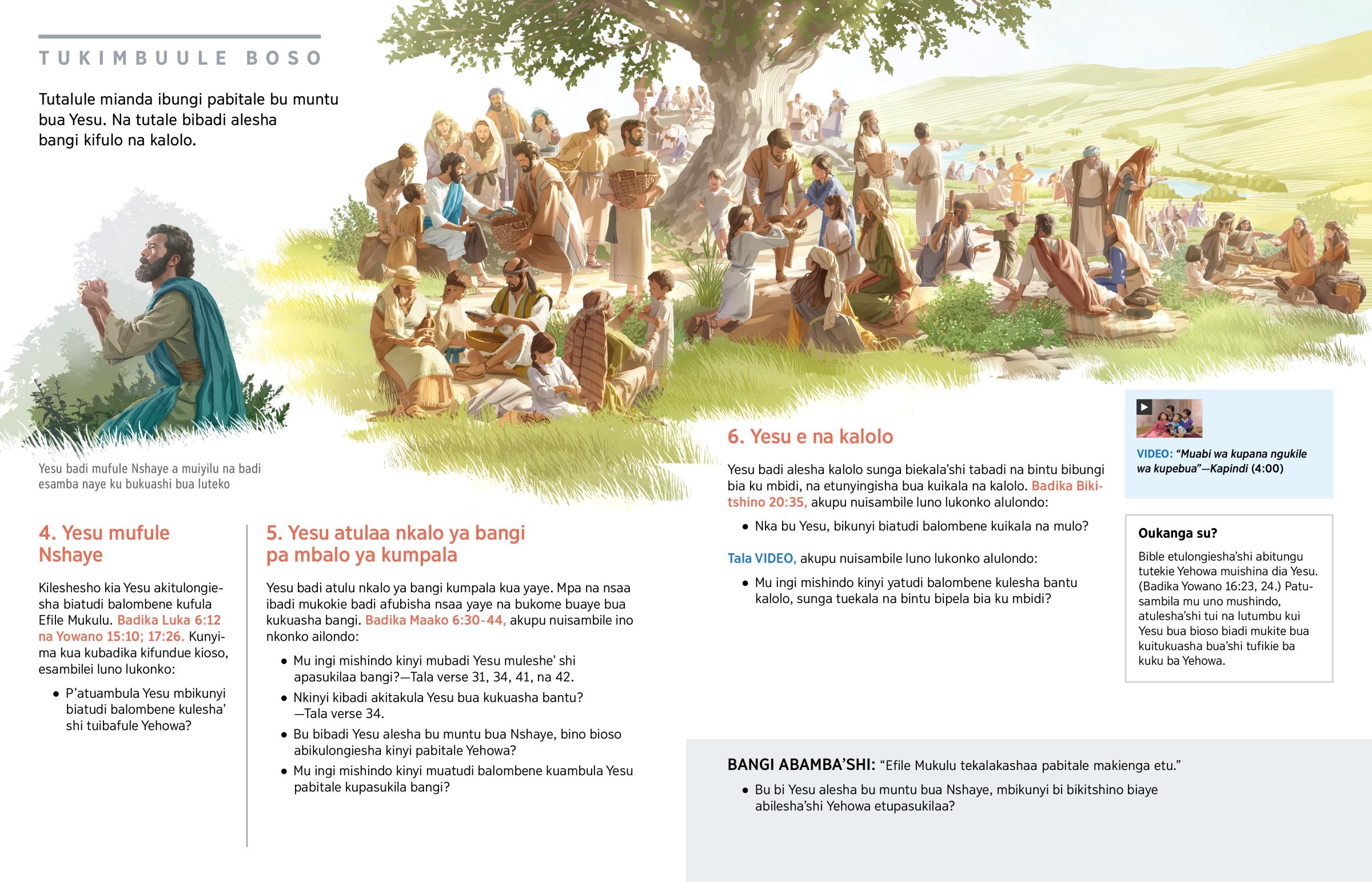 Nsaa yatulongo pabitale mianda ibakuile Yesu na ibakitshine pa Nsenga, atutundula ngikashi ibungi aitukuasha bua kuifubuila pepi naye na pepi na Nshaye Yehowa. Ku ngikashi ya Yesu, ngikunyi yosankilaa? Mushindo kinyi watudi balombene kuambula Yesu mu nshalelo etu?