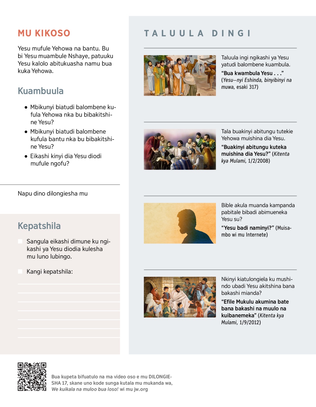 Pabadi muiyilu, Yesu badi atala bibadi Nshaye alesha kifulo na balongiele bibungi pabimutale munda mua bipua midiyala. Pa muanda wa biabia, Yesu anangushenaa, epushaa na kukita mianda nka bu Nshaye. (Badika Yowano 5:19.) Biabia, Yesu muambule bu muntu bua Nshaye mu mianda yoso, nyi buakinyi bakuile’shi: “Yawa bammono, bamono Yaya.” (Yowano 14:9) P’olongo pabitale bu muntu bua Yesu, onyinsha kuka Yehowa kalolo. Bu kileshesho, bibadi Yesu etuulu pa mbalo ya bangi abilesha namu abipushaa Yehowa pamuanda obe.