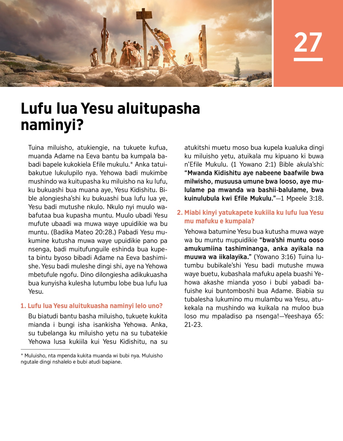 Tuina miluisho, atukiengie, na tukuete kufua, muanda Adame na Eeva bantu ba kumpala babadi bapele kukokiela Efile mukulu.a Anka tatuibakutue lukulupilo nya. Yehowa badi mukimbe mushindo wa kuitupasha ku miluisho na ku lufu, ku bukuashi bua muana aye, Yesu Kidishitu. Bible alongiesha’shi ku bukuashi bua lufu lua ye, Yesu badi mutushe nkulo. Nkulo nyi muulo wabafutaa bua kupasha muntu. Muulo ubadi Yesu mufute ubaadi wa muwa waye upuidikie wa bu muntu. (Badika Mateo 20:28.) Pabadi Yesu mukumine kutusha muwa waye upuidikie pano pa nsenga, badi muitufunguile eshinda bua kupeta bintu byoso bibadi Adame na Eeva bashimishe. Yesu badi muleshe dingi shi, aye na Yehowa mbetufule ngofu. Dino dilongiesha adikukuasha bua kunyisha kulesha lutumbu lobe bua lufu lua Yesu.
