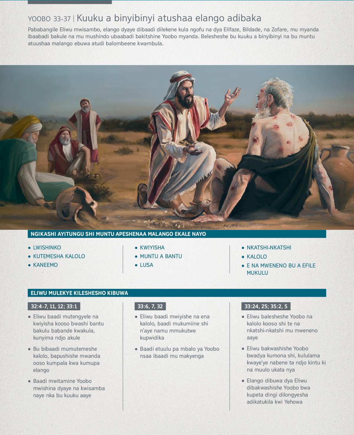 Pababangile Eliwu mwisambo, elango dyaye dibaadi dilekene kula ngofu na dya Elifaze, Bildade, na Zofare, mu myanda ibaabadi bakule na mu mushindo ubaabadi bakitshine Yoobo myanda. Belesheshe bu kuuku a binyibinyi na bu muntu atuushaa malango ebuwa atudi balombeene kwambula.