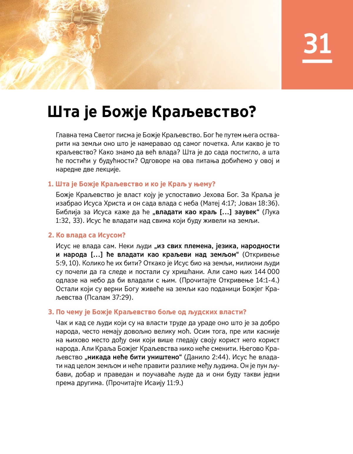 Главна тема Светог писма је Божје Краљевство. Бог ће путем њега остварити на земљи оно што је намеравао од самог почетка. Али какво је то краљевство? Како знамо да већ влада? Шта је до сада постигло, а шта ће постићи у будућности? Одговоре на ова питања добићемо у овој и наредне две лекције.