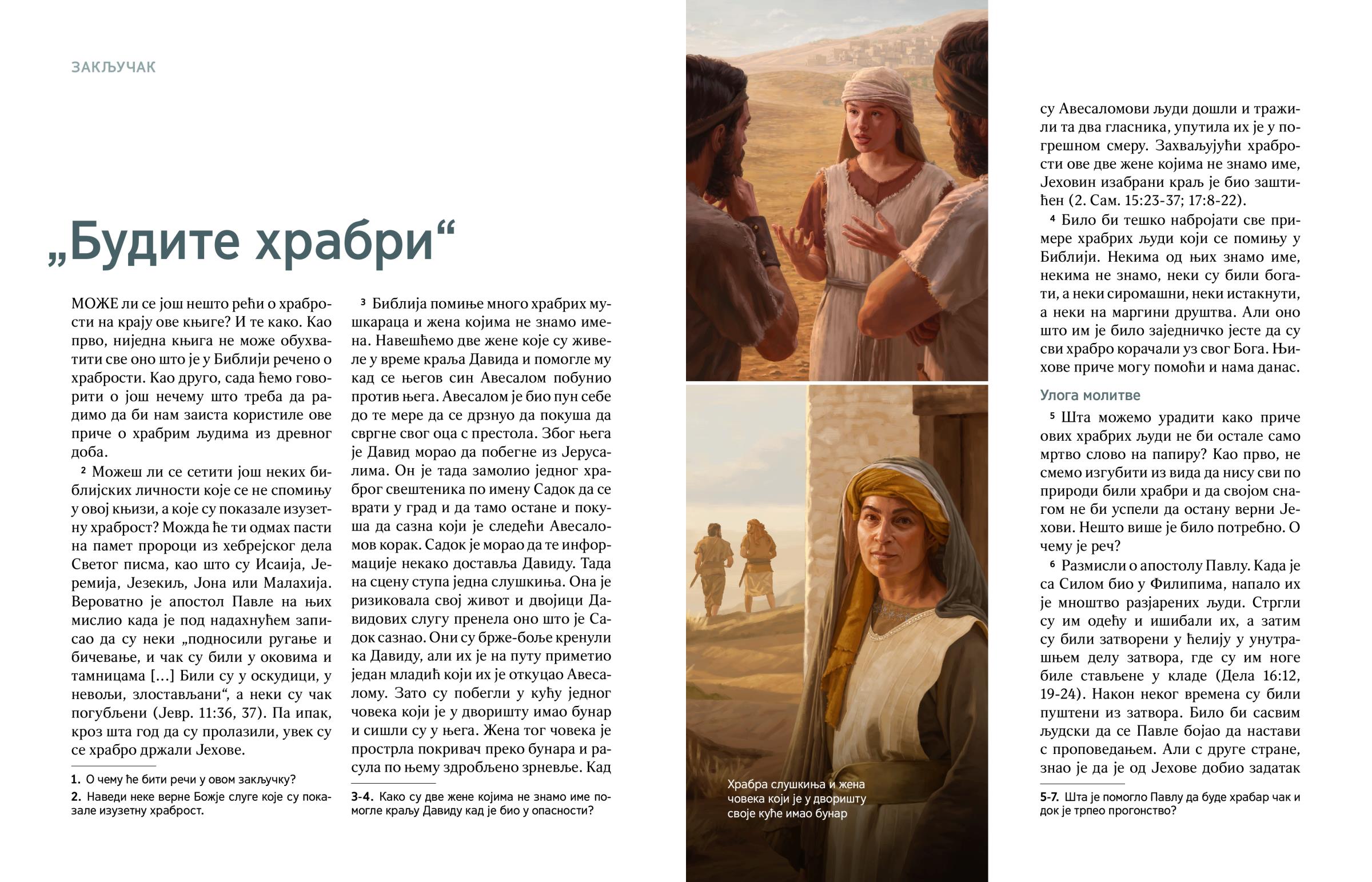 4 Било би тешко набројати све примере храбрих људи који се помињу у Библији. Некима од њих знамо име, некима не знамо, неки су били богати, а неки сиромашни, неки истакнути, а неки на маргини друштва. Али оно што им је било заједничко јесте да су сви храбро корачали уз свог Бога. Њихове приче могу помоћи и нама данас.