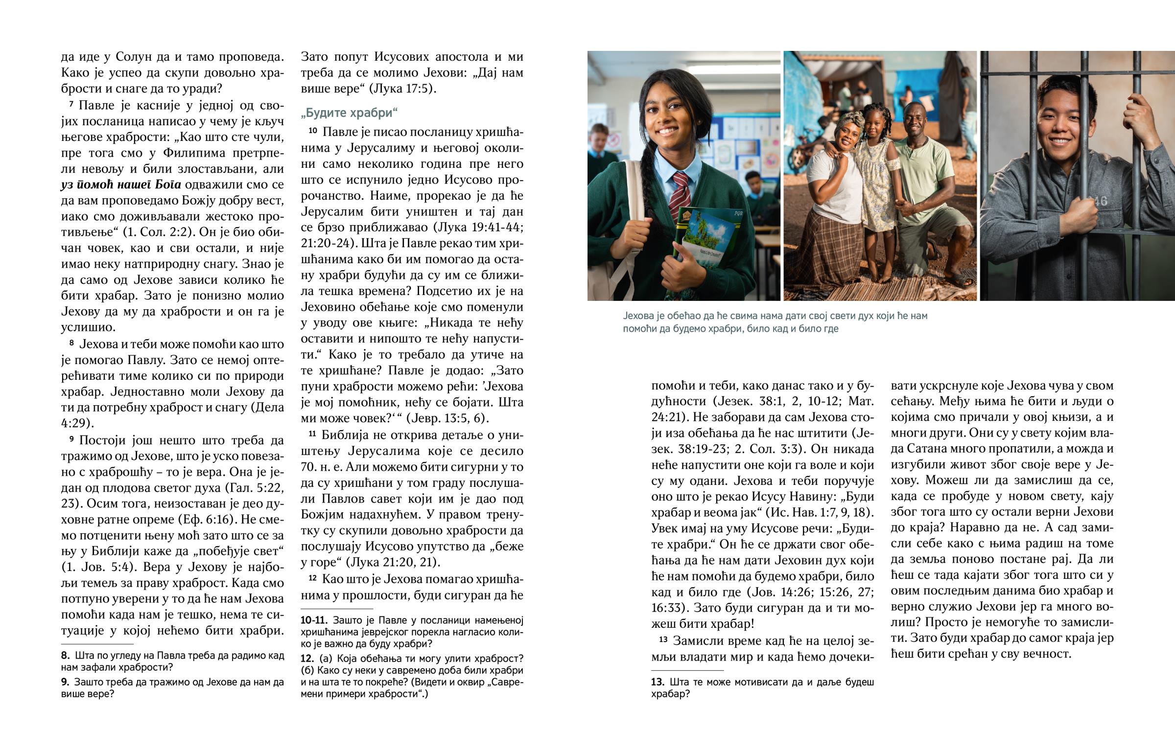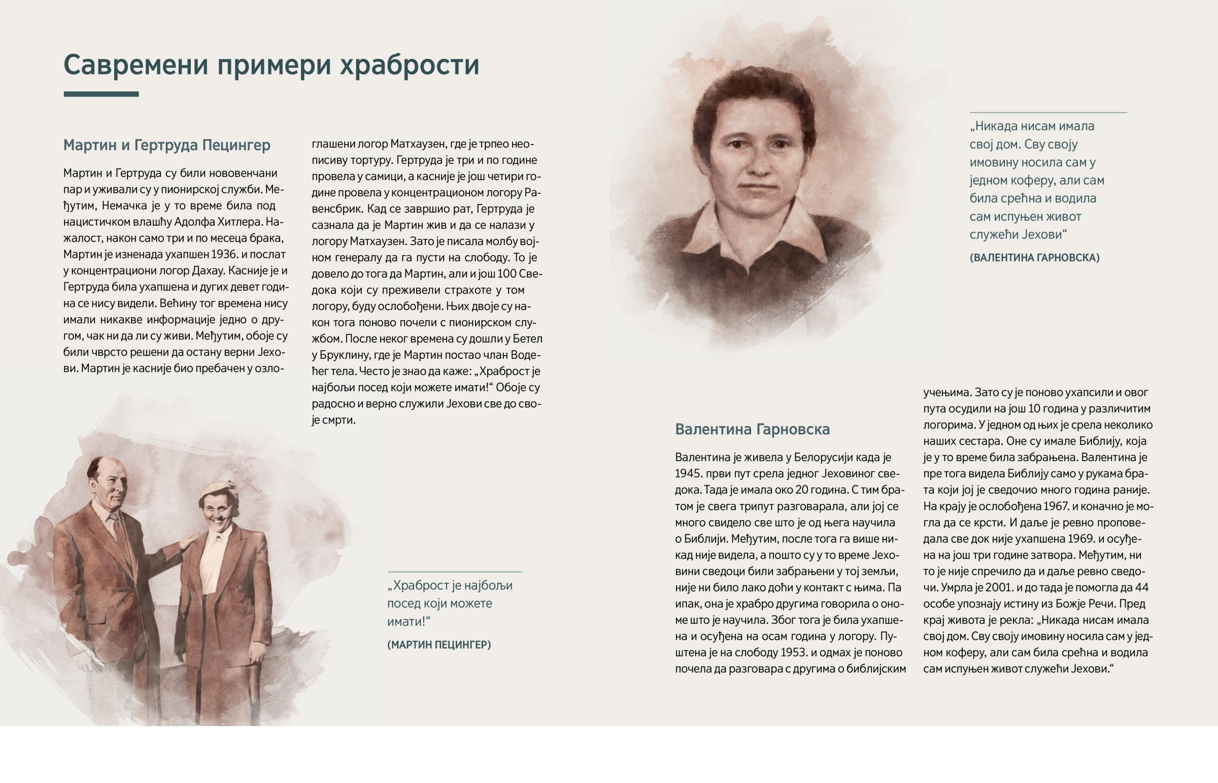 12 Као што је Јехова помагао хришћанима у прошлости, буди сигуран да ће помоћи и теби, како данас тако и у будућности (Језек. 38:1, 2, 10-12; Мат. 24:21). Не заборави да сам Јехова стоји иза обећања да ће нас штитити (Језек. 38:19-23; 2. Сол. 3:3). Он никада неће напустити оне који га воле и који су му одани. Јехова и теби поручује оно што је рекао Исусу Навину: „Буди храбар и веома јак“ (Ис. Нав. 1:7, 9, 18). Увек имај на уму Исусове речи: „Будите храбри.“ Он ће се држати свог обећања да ће нам дати Јеховин дух који ће нам помоћи да будемо храбри, било кад и било где (Јов. 14:26; 15:26, 27; 16:33). Зато буди сигуран да и ти можеш бити храбар!