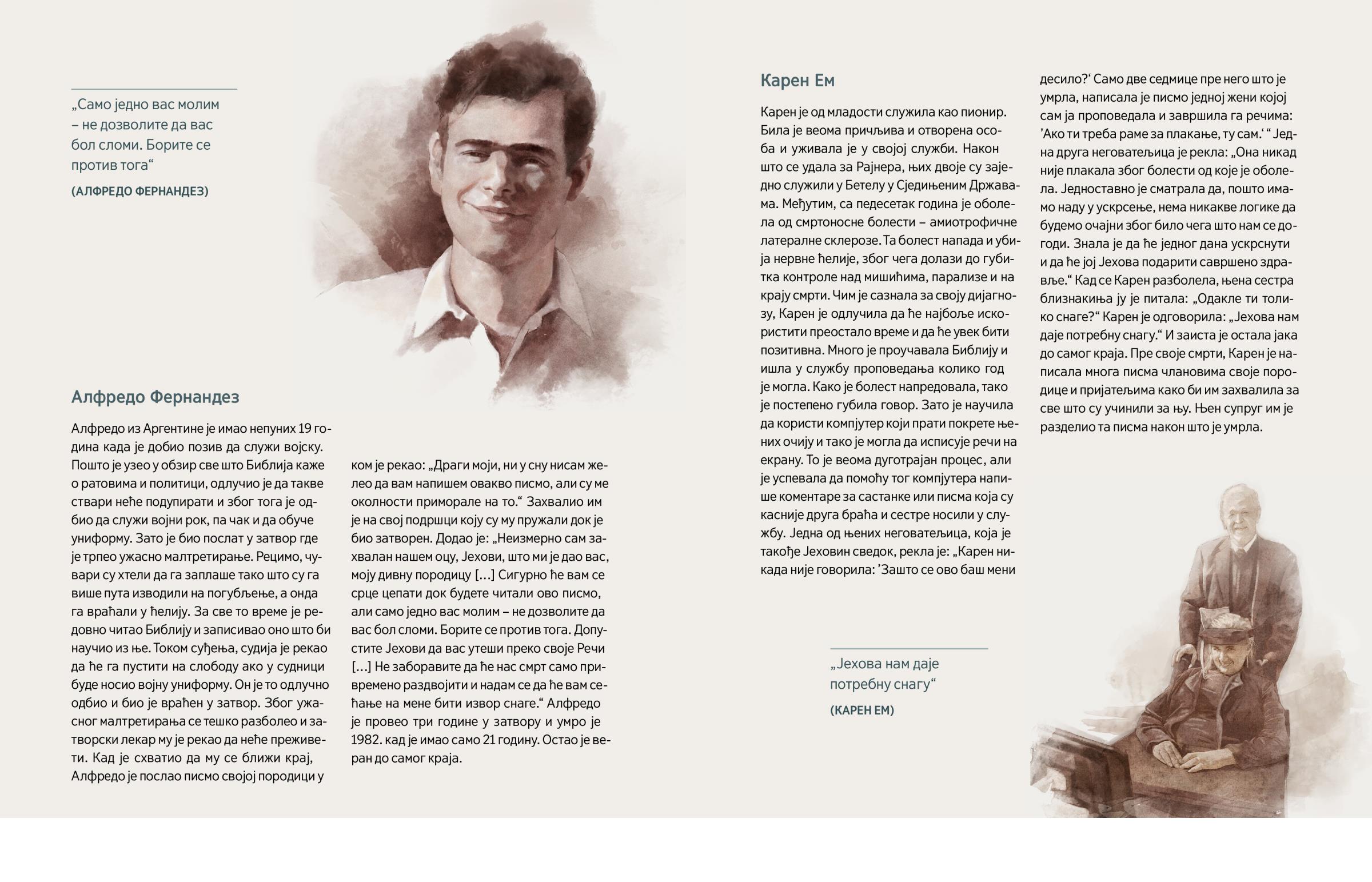 13 Замисли време кад ће на целој земљи владати мир и када ћемо дочекивати ускрснуле које Јехова чува у свом сећању. Међу њима ће бити и људи о којима смо причали у овој књизи, а и многи други. Они су у свету којим влада Сатана много пропатили, а можда и изгубили живот због своје вере у Јехову. Можеш ли да замислиш да се, када се пробуде у новом свету, кају због тога што су остали верни Јехови до краја? Наравно да не. А сад замисли себе како с њима радиш на томе да земља поново постане рај. Да ли ћеш се тада кајати због тога што си у овим последњим данима био храбар и верно служио Јехови јер га много волиш? Просто је немогуће то замислити. Зато буди храбар до самог краја јер ћеш бити срећан у сву вечност.