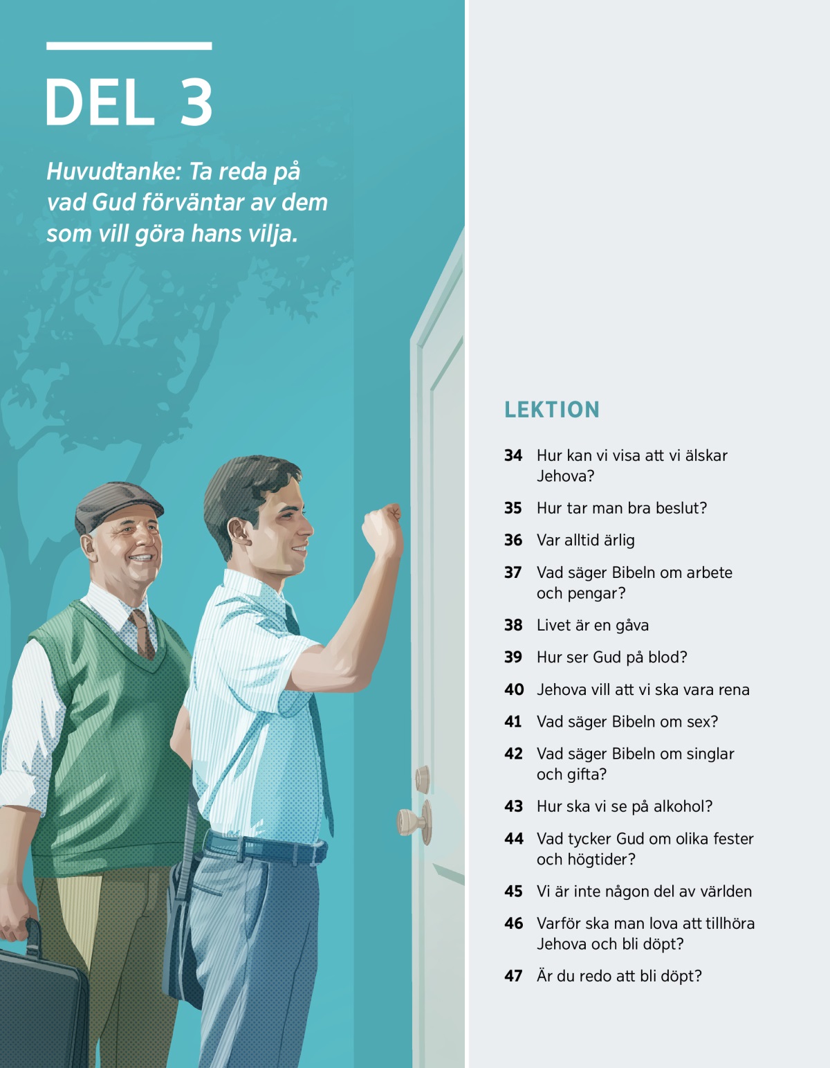 Del 3 Tryckt layout Huvudtanke: Ta reda på vad Gud förväntar av dem som vill göra hans vilja. LEKTION 34 Hur kan vi visa att vi älskar Jehova? 35 Hur tar man bra beslut? 36 Var alltid ärlig 37 Vad säger Bibeln om arbete och pengar? 38 Livet är en gåva 39 Hur ser Gud på blod? 40 Jehova vill att vi ska vara rena 41 Vad säger Bibeln om sex? 42 Vad säger Bibeln om singlar och gifta? 43 Hur ska vi se på alkohol? 44 Vad tycker Gud om olika fester och högtider? 45 Vi är inte någon del av världen 46 Varför ska man lova att tillhöra Jehova och bli döpt? 47 Är du redo att bli döpt?