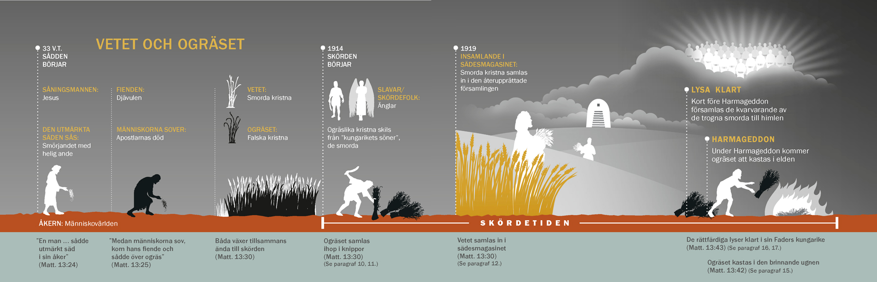 2 De händelser som utspelade sig på jordbrukarens åker illustrerar när och hur Jesus skulle samla ihop hela veteklassen – smorda kristna som ska regera tillsammans med honom i hans rike. Sådden började vid pingsten år 33 v.t. Insamlandet fullbordas när de smorda som lever vid slutet för den här världsordningen slutgiltigt blir försedda med sigill och sedan tas till himlen. (Matt. 24:31; Upp. 7:1–4) Precis som en utkikspunkt på ett berg kan ge oss en överblick över omgivningen kan den här liknelsen ge oss en panoramavy över händelser som skulle utspela sig under en period på omkring 2 000 år. Vilken händelseutveckling som hör samman med Guds rike kan vi se? Liknelsen beskriver en tid av sådd, tillväxt och skörd. Den här artikeln handlar främst om skördetiden.a
