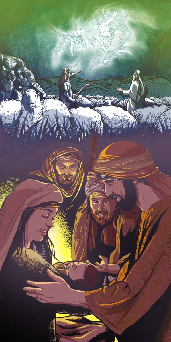Plötsligt visar sig en ängel för herdarna. Han säger till dem: ”I dag har det åt er fötts en Räddare, som är Kristus, Herren.” Ängeln berättar också att de ska hitta ”ett nyfött barn, som är lindat och ligger i en krubba”. Genast visar sig många fler änglar och börjar lovprisa Gud.