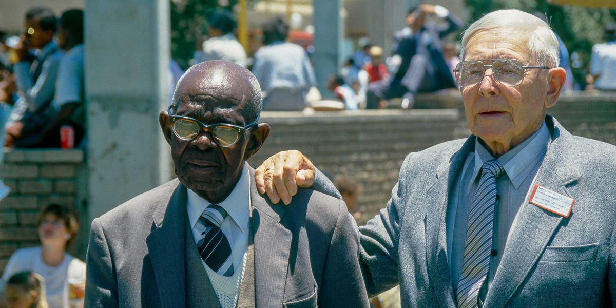 Thomas Skosana (till vänster) och Alfred Steynberg på en sammankomst 1985. Båda har varit Jehovas vittnen länge.
