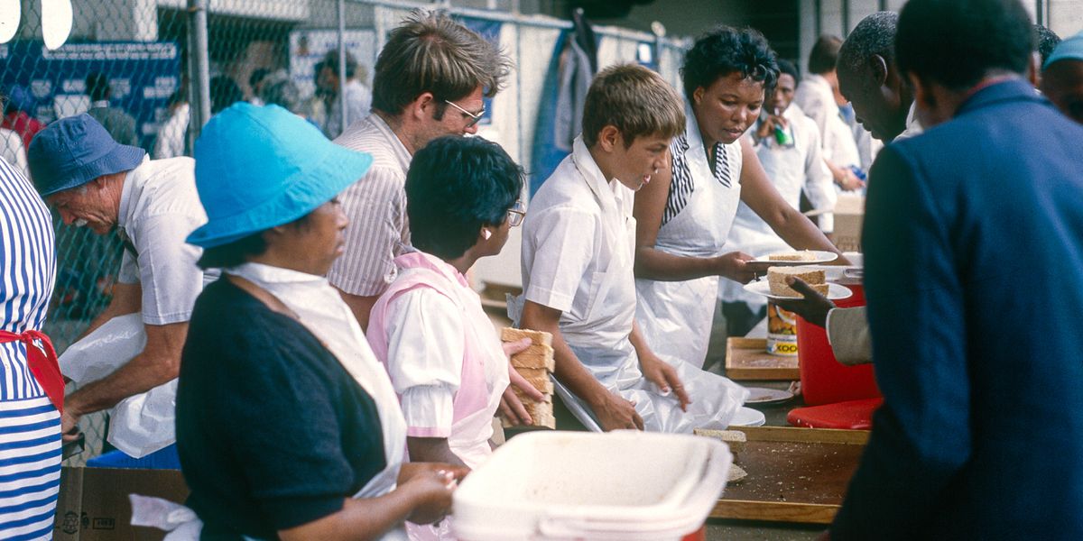 Jehovas vittnen med olika etnicitet serverar mat på en sammankomst 1985.