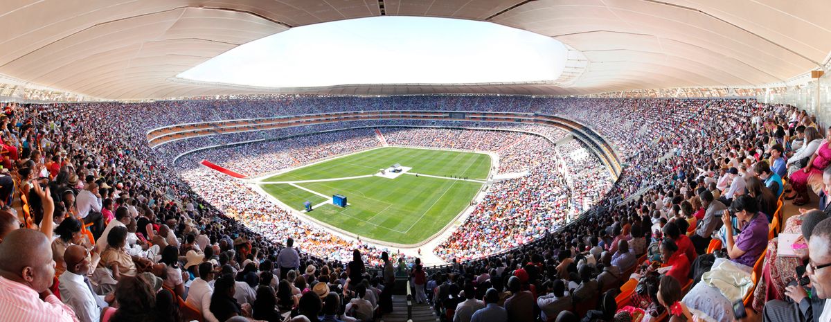 En stor grupp Jehovas vittnen med blandad etnicitet på ett möte på FNB Stadium i Johannesburg 2011.