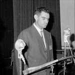 Ronald Jacka (till höger) håller ett tal vid sammankomsten ”Eviga goda nyheter” 1963 som tolkas.